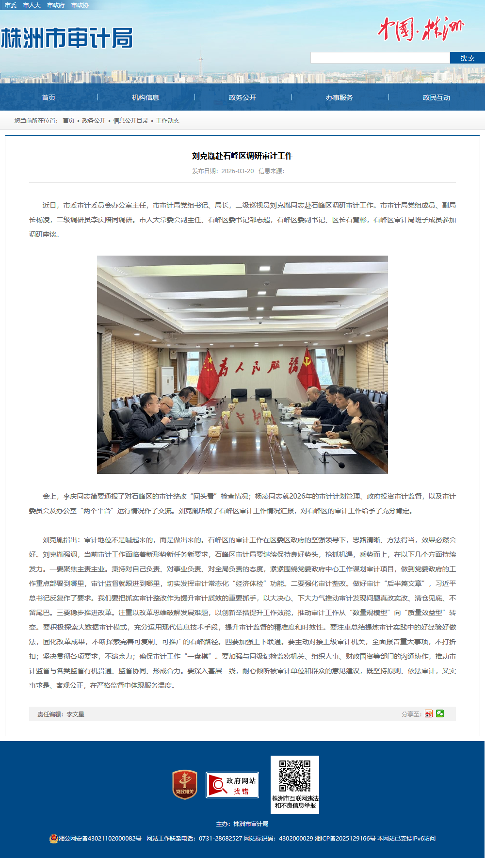 会上,李庆同志简要通报了对石峰区的审计整改“回头看”检查情况;杨凌同志就2026年的审计计划管理、政府投资审计监督,以及审计委员会及办公室“两个平台”运行情况作了交流。刘克胤听取了石峰区审计工作情况汇报,对石峰区的审计工作给予了充分肯定。