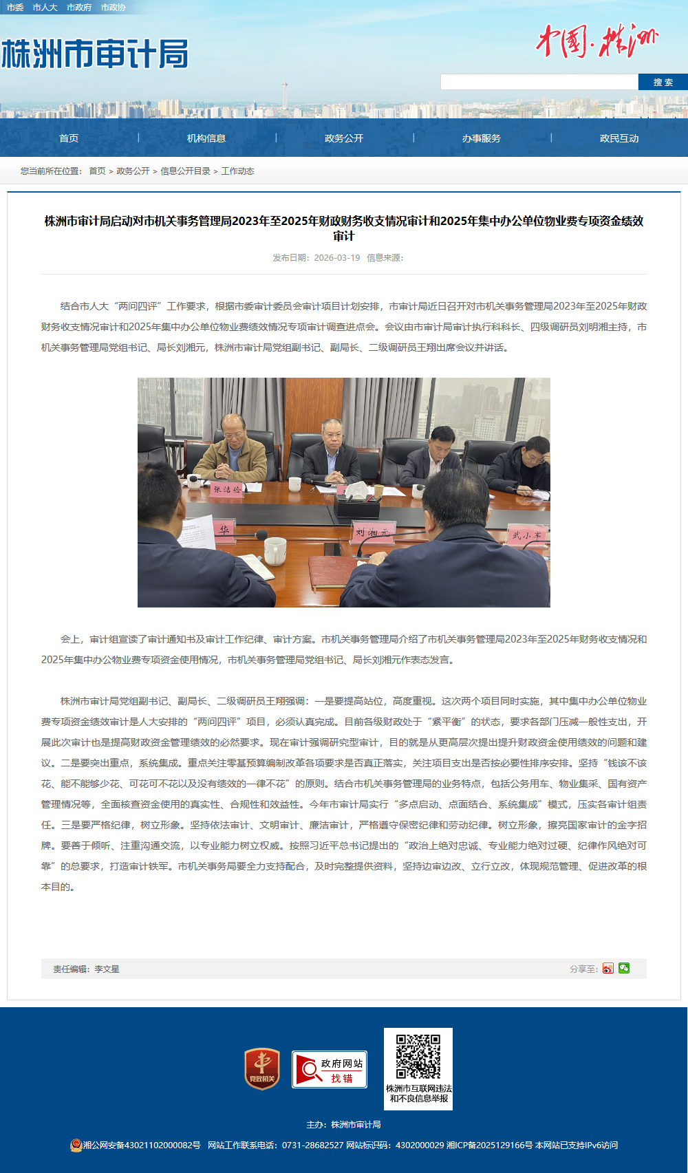 结合市人大“两问四评”工作要求,根据市委审计委员会审计项目计划安排,市审计局近日召开对市机关事务管理局2023年至2025年财政财务收支情况审计和2025年集中办公单位物业费绩效情况专项审计调查进点会。会议由市审计局审计执行科科长、四级调研员刘明湘主持,市机关事务管理局党组书记、局长刘湘元,株洲市审计局党组副书记、副局长、二级调研员王翔出席会议并讲话。