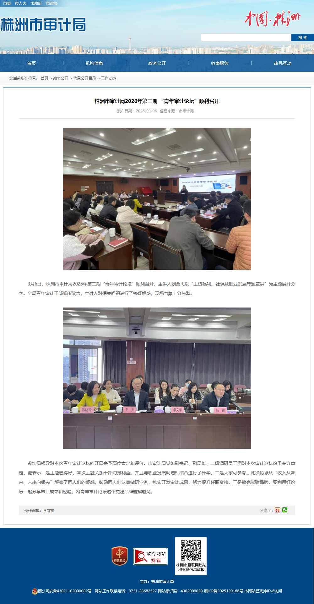 3月6日,株洲市审计局2026年第二期“青年审计论坛”顺利召开,主讲人刘美飞以“工资福利、社保及职业发展专题宣讲”为主题展开分享。全局青年审计干部畅所欲言,主讲人对相关问题进行了答疑解惑,现场气氛十分热烈。