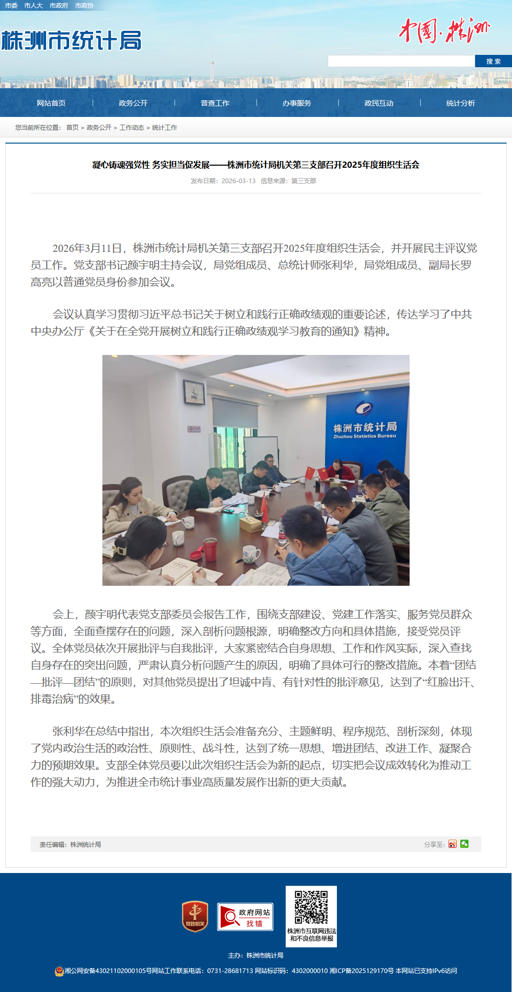 2026年3月11日,株洲市统计局机关第三支部召开2025年度组织生活会,并开展民主评议党员工作。党支部书记颜宇明主持会议,局党组成员、总统计师张利华,局党组成员、副局长罗高亮以普通党员身份参加会议。