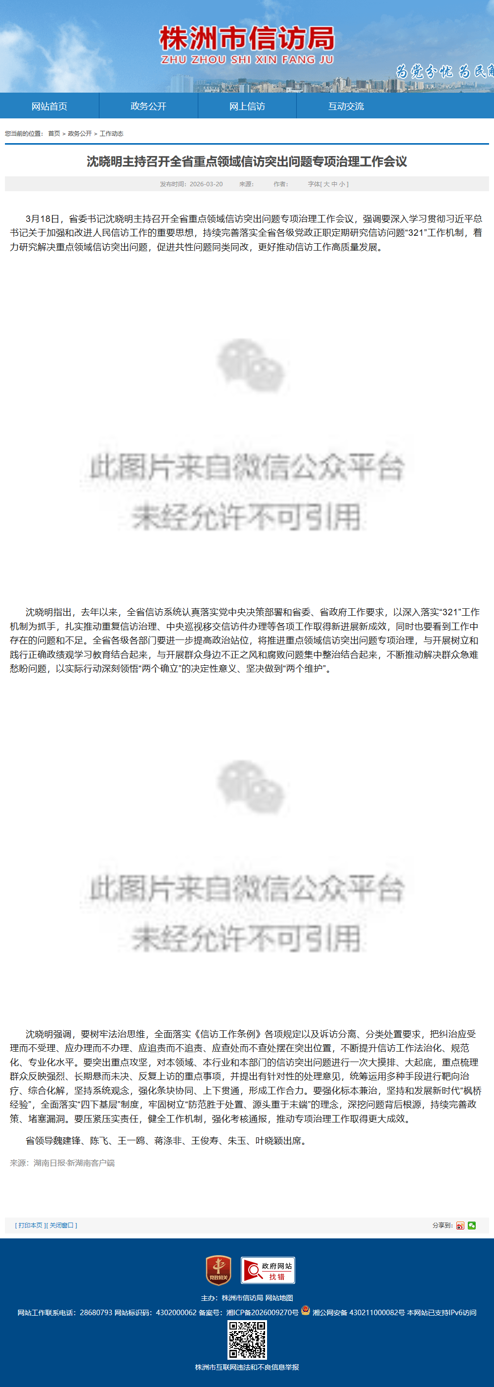 3月18日,省委书记沈晓明主持召开全省重点领域信访突出问题专项治理工作会议,强调要深入学习贯彻习近平总书记关于加强和改进人民信访工作的重要思想,持续完善落实全省各级党政正职定期研究信访问题“321”工作机制,着力研究解决重点领域信访突出问题,促进共性问题同类同改,更好推动信访工作高质量发展。