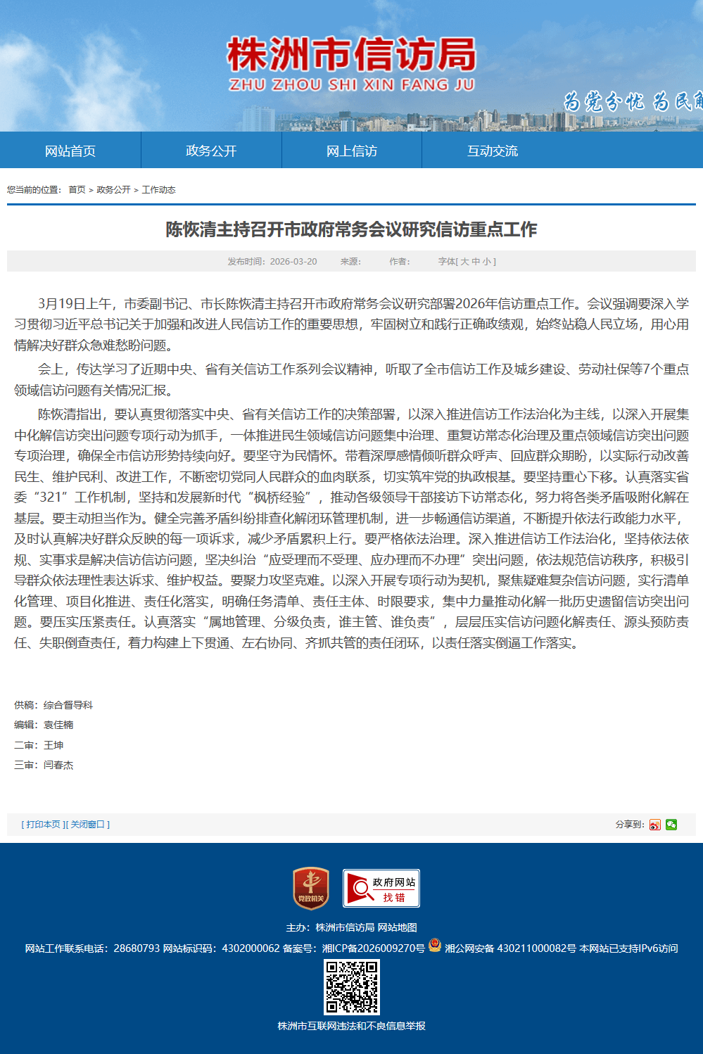 3月19日上午,市委副书记、市长陈恢清主持召开市政府常务会议研究部署2026年信访重点工作。会议强调要深入学习贯彻习近平总书记关于加强和改进人民信访工作的重要思想,牢固树立和践行正确政绩观,始终站稳人民立场,用心用情解决好群众急难愁盼问题。