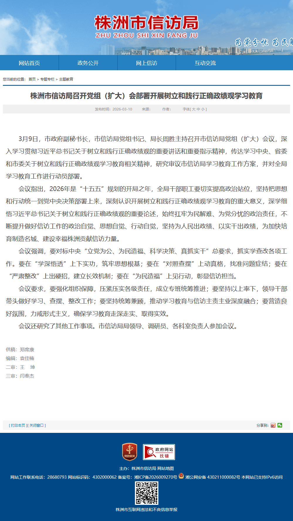 会议指出,2026年是“十五五”规划的开局之年,全局干部职工要切实提高政治站位,坚持把思想和行动统一到党中央决策部署上来,深刻认识开展树立和践行正确政绩观学习教育的重大意义,深学细悟习近平总书记关于树立和践行正确政绩观的重要论述,始终扛牢为民解难、为党分忧的政治责任,不断提升做好信访工作的政治自觉、思想自觉、行动自觉,坚持为人民出政绩、以实干出政绩,为加快培育制造名城、建设幸福株洲贡献信访力量。
