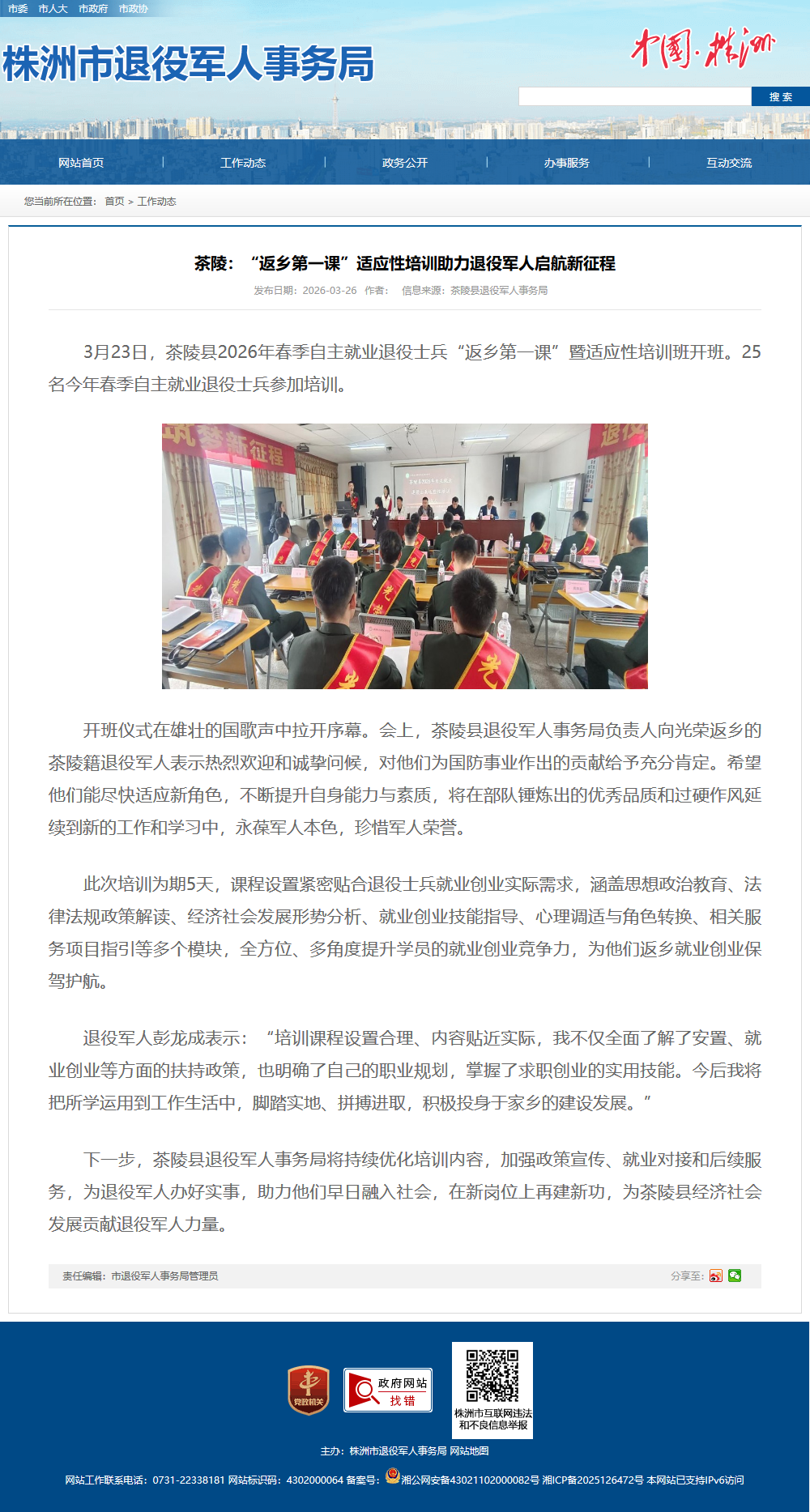 3月23日,茶陵县2026年春季自主就业退役士兵“返乡第一课”暨适应性培训班开班。25名今年春季自主就业退役士兵参加培训。