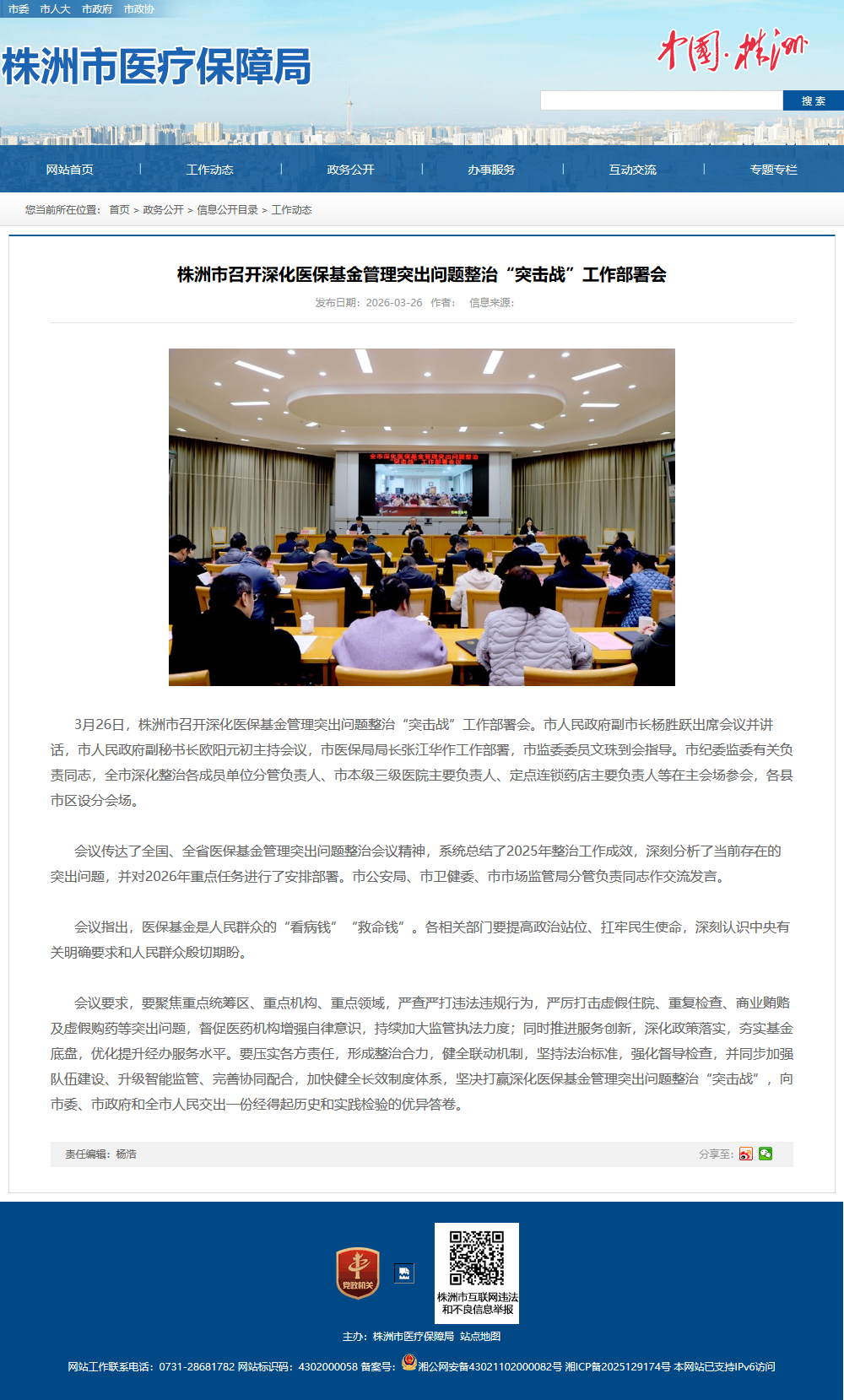 3月26日,株洲市召开深化医保基金管理突出问题整治“突击战”工作部署会。市人民政府副市长杨胜跃出席会议并讲话,市人民政府副秘书长欧阳元初主持会议,市医保局局长张江华作工作部署,市监委委员文珠到会指导。市纪委监委有关负责同志,全市深化整治各成员单位分管负责人、市本级三级医院主要负责人、定点连锁药店主要负责人等在主会场参会,各县市区设分会场。