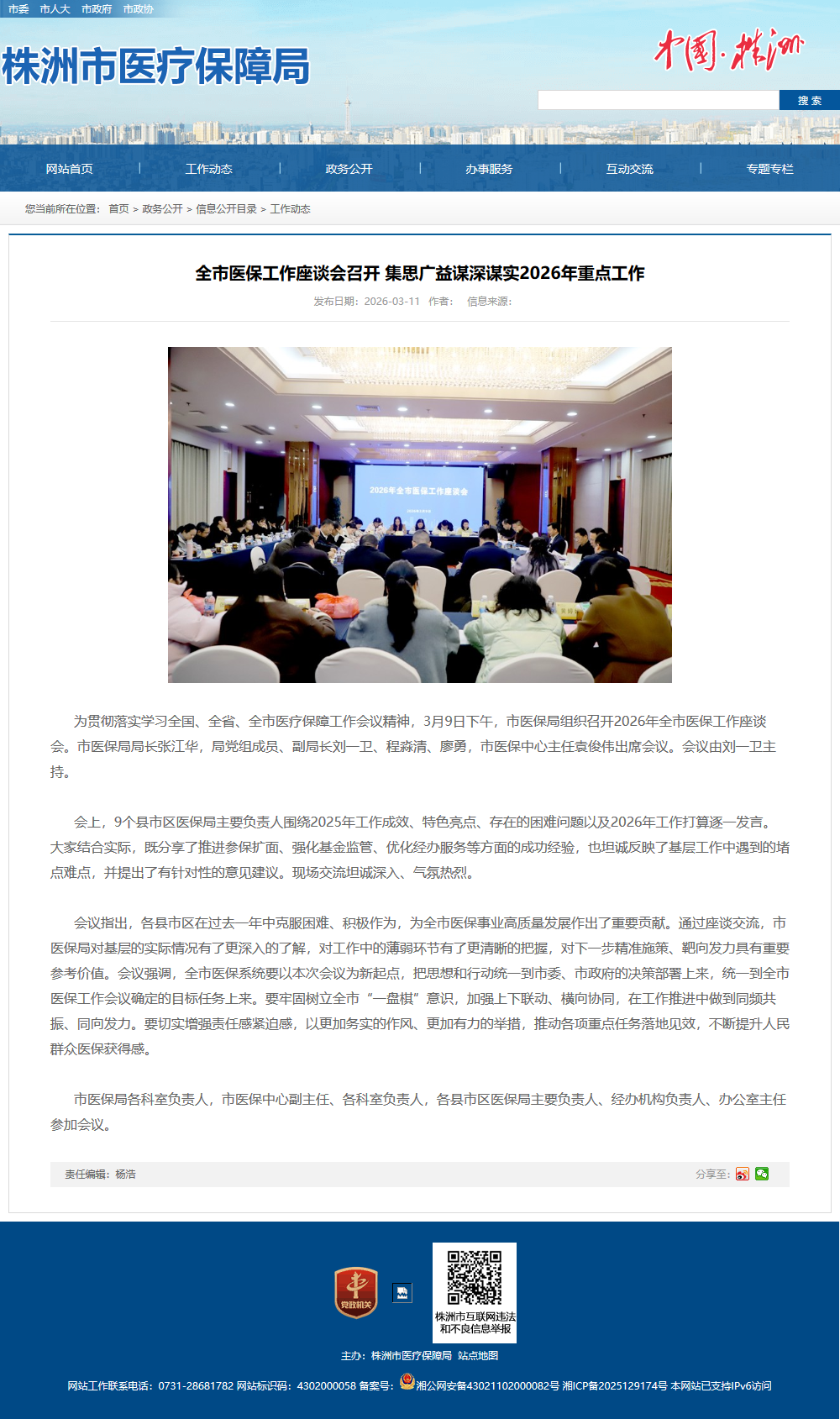 为贯彻落实学习全国、全省、全市医疗保障工作会议精神,3月9日下午,市医保局组织召开2026年全市医保工作座谈会。市医保局局长张江华,局党组成员、副局长刘一卫、程淼清、廖勇,市医保中心主任袁俊伟出席会议。会议由刘一卫主持。