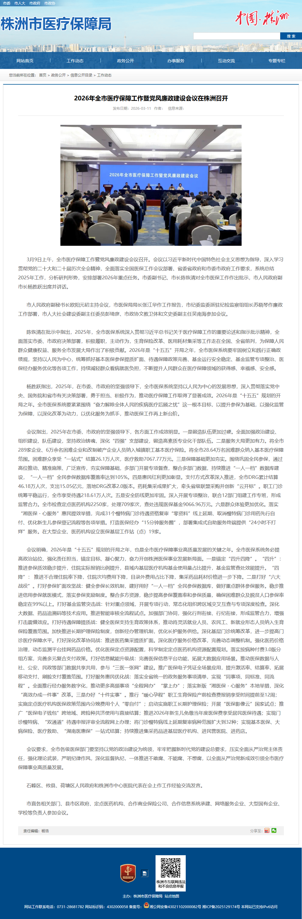 会议明确,2026年是“十五五”规划的开局之年,也是全市医疗保障事业高质量发展的关键之年。全市医保系统务必提高政治站位、强化责任担当,锚定目标、凝心聚力,奋力开创株洲医保事业发展新局面。一是锚定“四升四降”。“四升”:推进参保质效稳步提升,住院实际报销比例提升,县域内基层医疗机构基金使用量占比提升,基金监管查处效能提升。“四降”: 推进不合理住院率下降,住院次均费用下降,目录外费用占比下降,集采药品耗材价格进一步下降。二是打好“六大战役”。打好参保扩面攻坚战:健全参保长效机制,建好用好“一人一档”全民参保数据库,做好重点群体参保服务。稳步推进信用参保就医模式,落实参保奖励制度。整合多方资源,稳步提高参保覆盖率和参保质量,确保困难群众及脱贫人口参保率稳定在99%以上。打好基金监管突击战:针对重点领域,开展专项行动,常态化组织跨区域交叉互查与专项深度检查。深化大数据、药品追溯码等技术应用。推进智能审核全流程试点。加强部门协同,强化行刑衔接、行纪衔接,形成监管合力,增强打击震慑效应。打好待遇保障提质战:健全医保支持生育政策体系,推动将灵活就业人员、农民工、新就业形态人员纳入生育保险覆盖范围。加快推进长期护理保险制度,创新经办管理机制,优化长护服务供给。深化基层门诊统筹改革,进一步提高门诊医疗保障水平。打好深化改革协同战:推进医药集采提质扩面。深化医疗服务价格改革,完善动态调整机制。强化医药价格治理,动态监测平台挂网药品价格。优化医保定点资源配置,科学制定定点医药机构资源配置规划。落实按病种付费3.0版分组方案,完善多元复合支付政策。打好信息赋能升级战:完善医保信息平台功能,拓展大数据应用场景。推动医保数据与人社、公安、民政等部门数据共享共用,参与“三医一张网”建设。推广医保电子凭证全场景应用,提升激活率、结算率,拓展移动支付、刷脸支付覆盖范围。打好服务惠民优化战:落实全省统一的政务服务事项清单,实现“同事项、同标准、同流程”。全面推行经办服务数字化,推动更多高频事项“全程网办”“掌上办”;落实新版“湘医保・心服务”本地举措,深化“高效办成一件事”改革。三是办好“十件实事”。推行“暖心孕程”职工生育保险产前检查费报销享受时间提前至12周;实施定点医疗机构医保政策范围内分娩费用个人“零自付”;启动实施职工长期护理保险;开展“医保影像云”国家试点;推广“医保电子钱包”跨地域、跨险种共济使用与直接结算;推进2026年新生儿免缴当年度医保费享受居民医保待遇;实现门诊慢特病、“双通道”待遇申报评审全流程网上办理;将门诊慢特病线上延期复审病种范围扩大到32种;实现基本医保、大病保险、医疗救助、“湖南医惠保”一站式结算;持续推进集采药品进基层医疗机构、进民营医院、进药店。