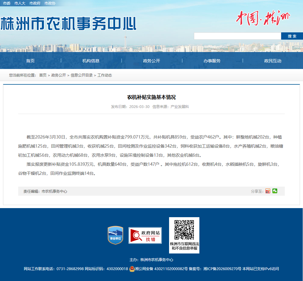 截至2026年3月30日,全市共落实农机购置补贴资金799.071万元,共补贴机具859台,受益农户462户。其中:耕整地机械202台,种植施肥机械125台,田间管理机械3台,收获机械25台,田间检测及作业监控设备342台,饲料收获加工运输设备8台,水产养殖机械2台,粮油糖初加工机械56台,农用动力机械68台,农用水泵9台,设施环境控制设备13台,其他农业机械6台。
