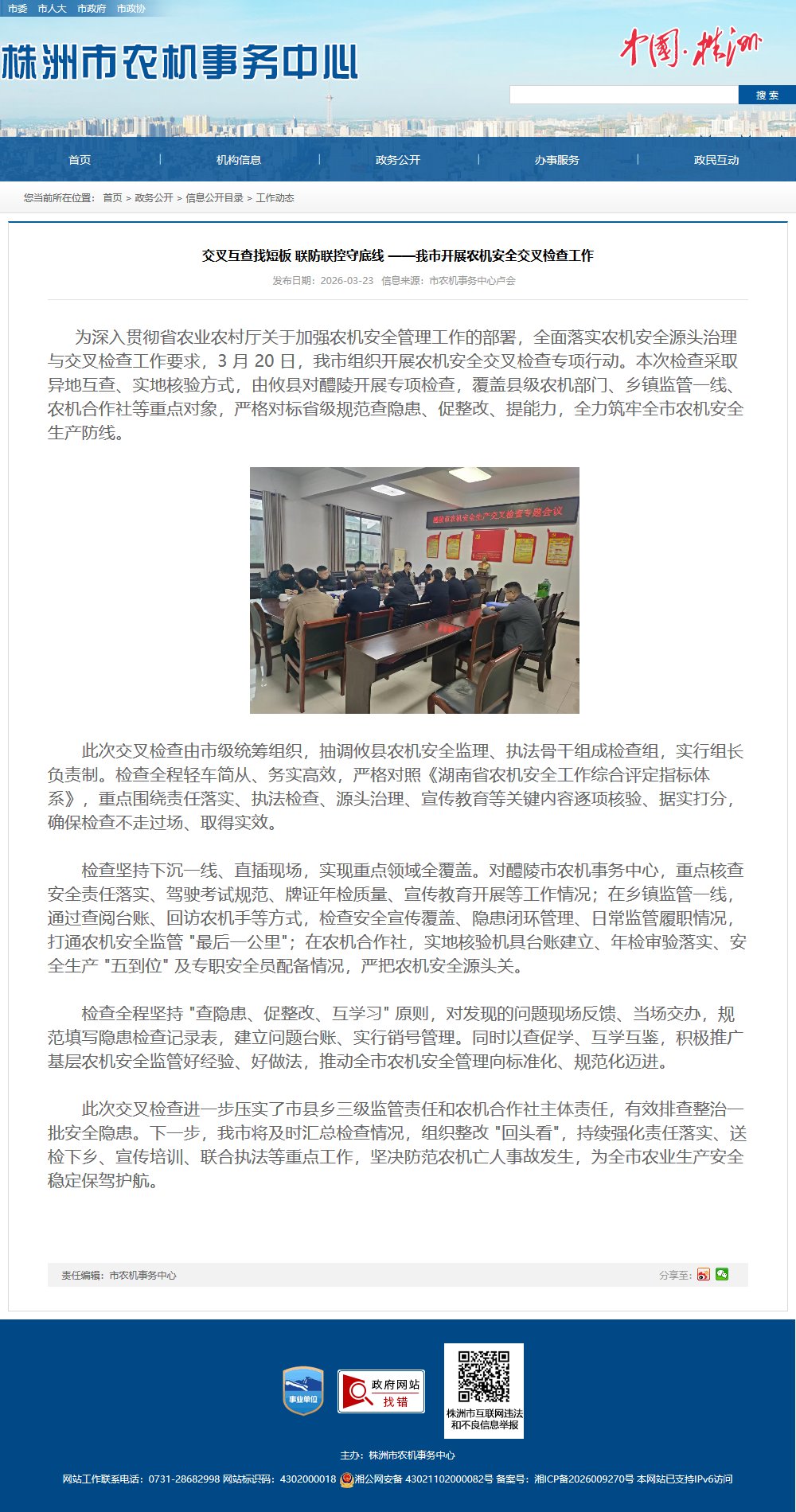 为深入贯彻省农业农村厅关于加强农机安全管理工作的部署,全面落实农机安全源头治理与交叉检查工作要求,3 月 20 日,我市组织开展农机安全交叉检查专项行动。本次检查采取异地互查、实地核验方式,由攸县对醴陵开展专项检查,覆盖县级农机部门、乡镇监管一线、农机合作社等重点对象,严格对标省级规范查隐患、促整改、提能力,全力筑牢全市农机安全生产防线。