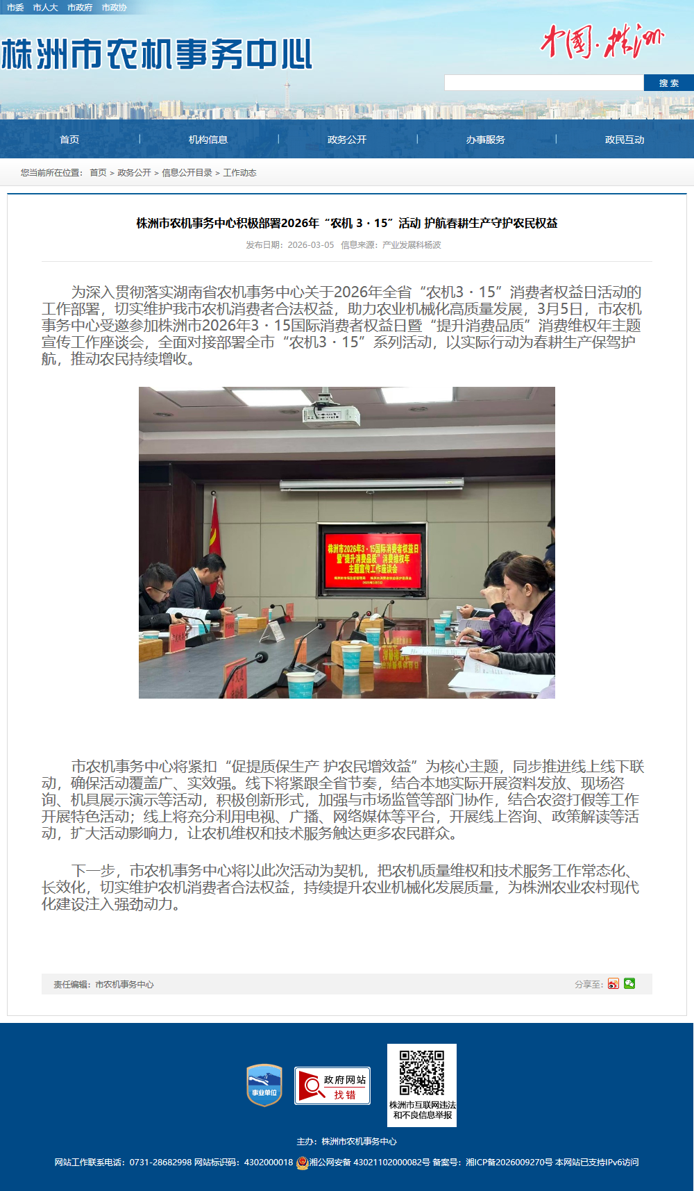 为深入贯彻落实湖南省农机事务中心关于2026年全省“农机3・15”消费者权益日活动的工作部署,切实维护我市农机消费者合法权益,助力农业机械化高质量发展,3月5日,市农机事务中心受邀参加株洲市2026年3・15国际消费者权益日暨“提升消费品质”消费维权年主题宣传工作座谈会,全面对接部署全市“农机3・15”系列活动,以实际行动为春耕生产保驾护航,推动农民持续增收。