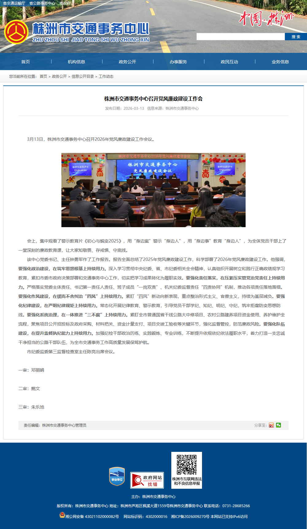 3月13日,株洲市交通事务中心召开2026年党风廉政建设工作会议。