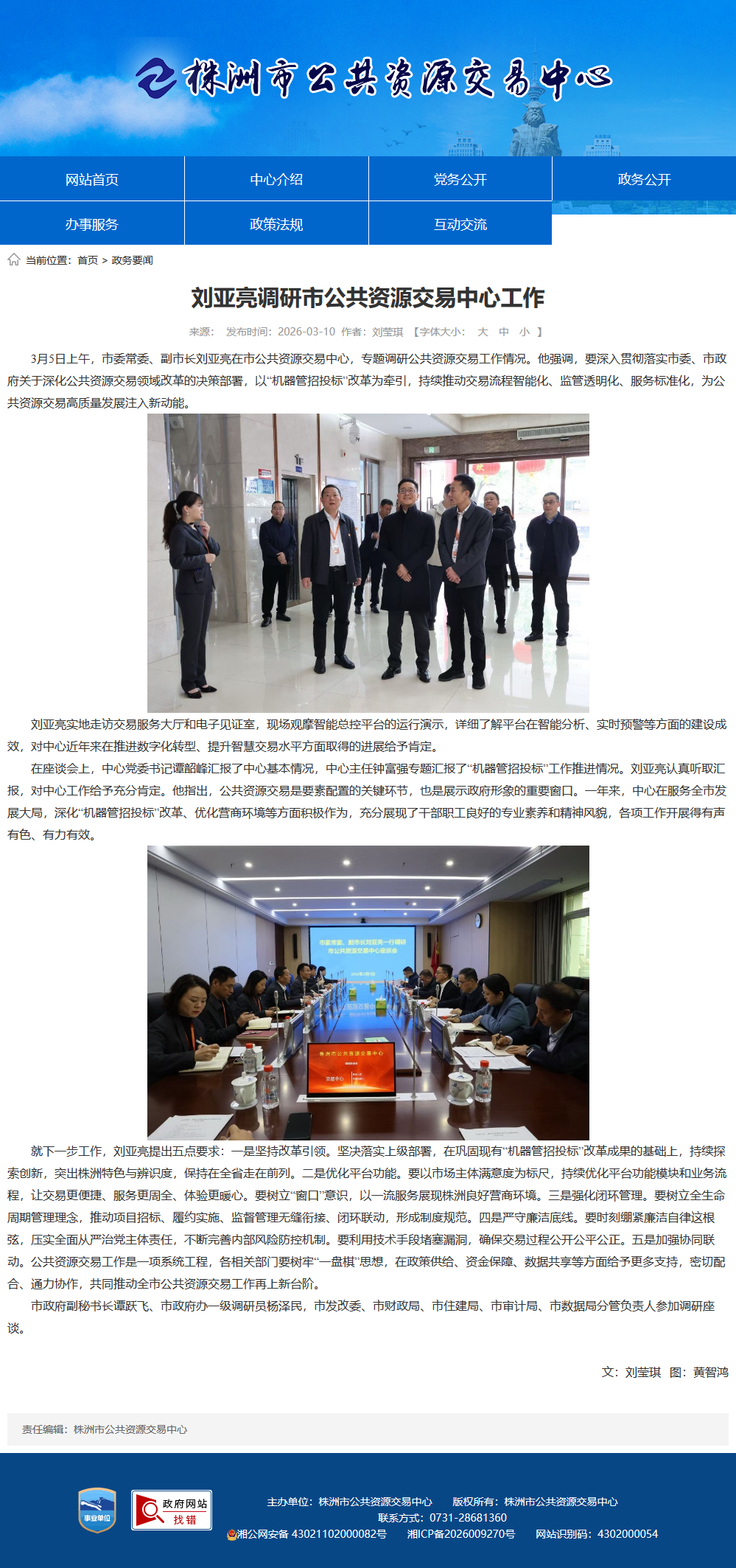 就下一步工作,刘亚亮提出五点要求:一是坚持改革引领。坚决落实上级部署,在巩固现有“机器管招投标”改革成果的基础上,持续探索创新,突出株洲特色与辨识度,保持在全省走在前列。二是优化平台功能。要以市场主体满意度为标尺,持续优化平台功能模块和业务流程,让交易更便捷、服务更周全、体验更暖心。要树立“窗口”意识,以一流服务展现株洲良好营商环境。三是强化闭环管理。要树立全生命周期管理理念,推动项目招标、履约实施、监督管理无缝衔接、闭环联动,形成制度规范。四是严守廉洁底线。要时刻绷紧廉洁自律这根弦,压实全面从严治党主体责任,不断完善内部风险防控机制。要利用技术手段堵塞漏洞,确保交易过程公开公平公正。五是加强协同联动。公共资源交易工作是一项系统工程,各相关部门要树牢“一盘棋”思想,在政策供给、资金保障、数据共享等方面给予更多支持,密切配合、通力协作,共同推动全市公共资源交易工作再上新台阶。
