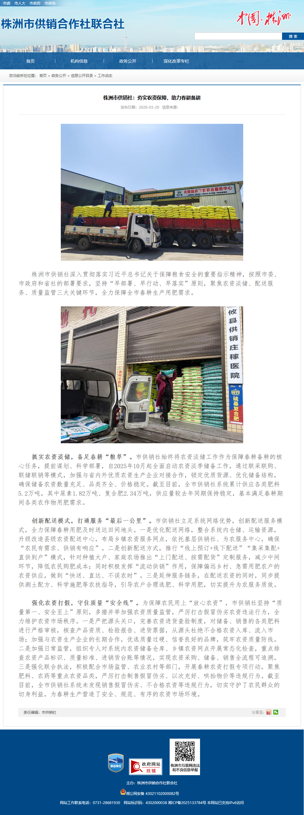 株洲市供销社深入贯彻落实习近平总书记关于保障粮食安全的重要指示精神,按照市委、市政府和省社的部署要求,坚持“早部署、早行动、早落实”原则,聚焦农资淡储、配送服务、质量监管三大关键环节,全力保障全市春耕生产用肥需求。