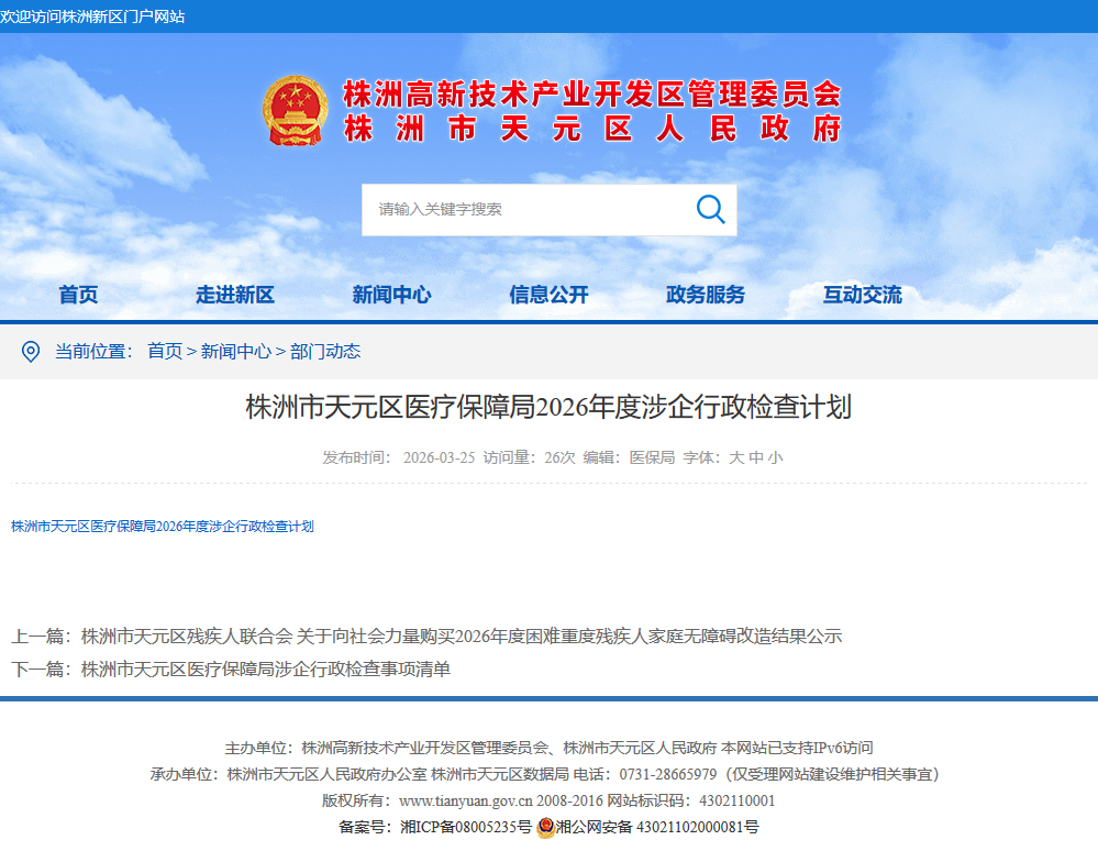 株洲市天元区医疗保障局2026年度涉企行政检查计划