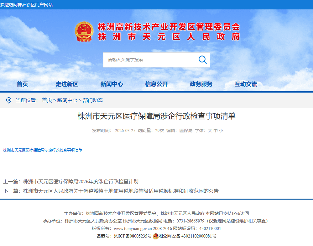 株洲市天元区医疗保障局2026年度涉企行政检查计划