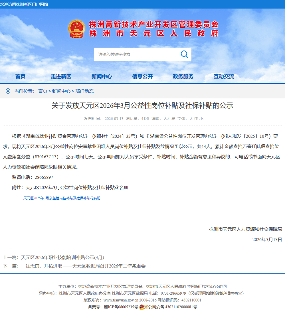 根据《湖南省就业补助资金管理办法》(湘财社〔2024〕33号)和《 湖南省公益性岗位开发管理办法》(湘人规发〔2025〕10号)要求,现将天元区2026年3月公益性岗位安置就业困难人员岗位补贴及社保补贴发放情况予以公示,共43人,累计金额叁拾万壹仟陆佰叁拾柒元壹角叁分整(¥301637.13),公示时间七天。公示期间如对人员享受条件、补贴时间、补贴金额有意见和异议的,可电话或书面向天元区人力资源和社会保障局反映相关情况。