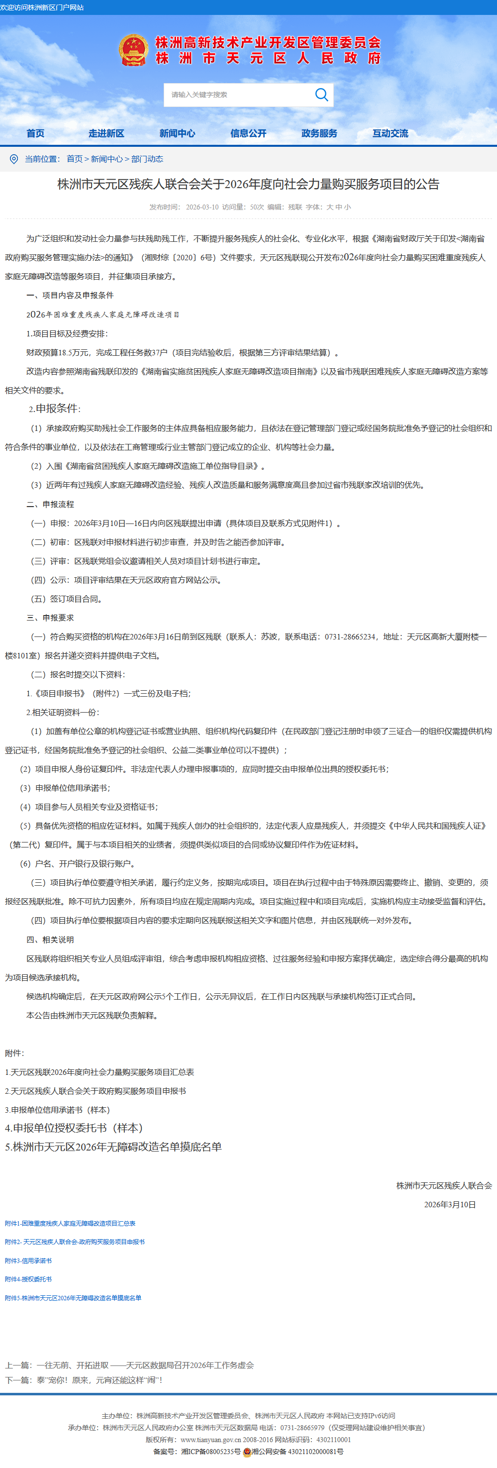 为广泛组织和发动社会力量参与扶残助残工作,不断提升服务残疾人的社会化、专业化水平,根据《湖南省财政厅关于印发<湖南省政府购买服务管理实施办法>的通知》(湘财综〔2020〕6号)文件要求,天元区残联现公开发布2026年度向社会力量购买困难重度残疾人家庭无障碍改造等服务项目,并征集项目承接方。