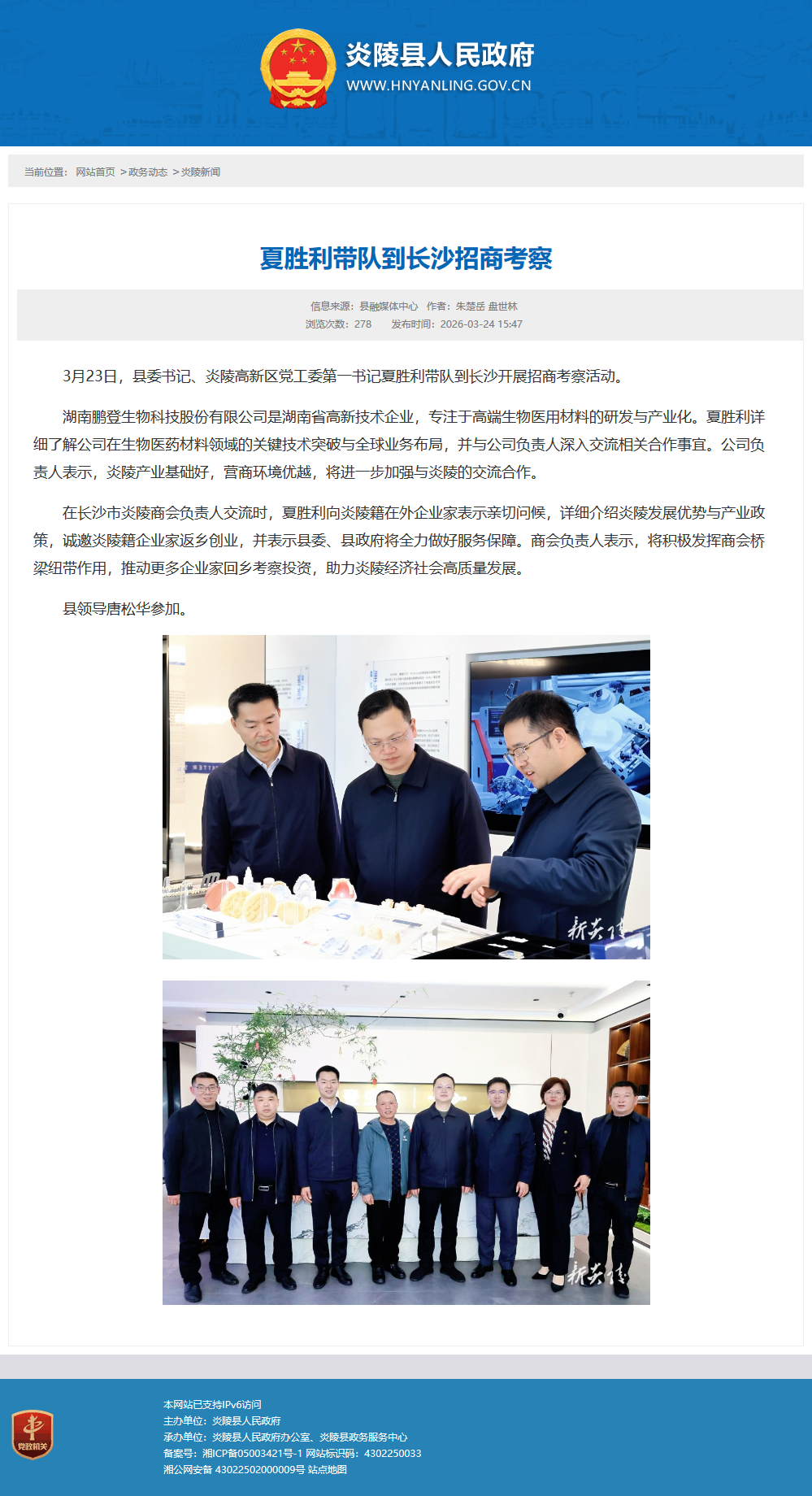 湖南鹏登生物科技股份有限公司是湖南省高新技术企业,专注于高端生物医用材料的研发与产业化。夏胜利详细了解公司在生物医药材料领域的关键技术突破与全球业务布局,并与公司负责人深入交流相关合作事宜。公司负责人表示,炎陵产业基础好,营商环境优越,将进一步加强与炎陵的交流合作。