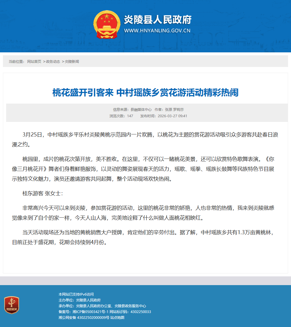 3月25日,中村瑶族乡平乐村炎陵黄桃示范园内一片欢腾,以桃花为主题的赏花游活动吸引众多游客共赴春日浪漫之约。