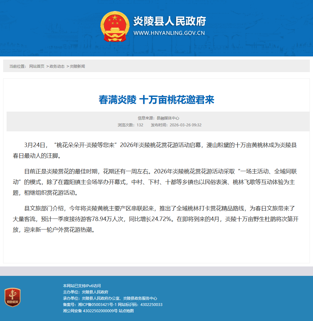 目前正是炎陵赏花的最佳时期,花期还有一周左右。2026年炎陵桃花赏花游活动采取“一场主活动、全域同联动”的模式,除了在霞阳镇主会场举办开幕式,中村、下村、十都等乡镇也以民俗表演、桃林飞歌等互动体验为主题,相继组织赏花游活动。
