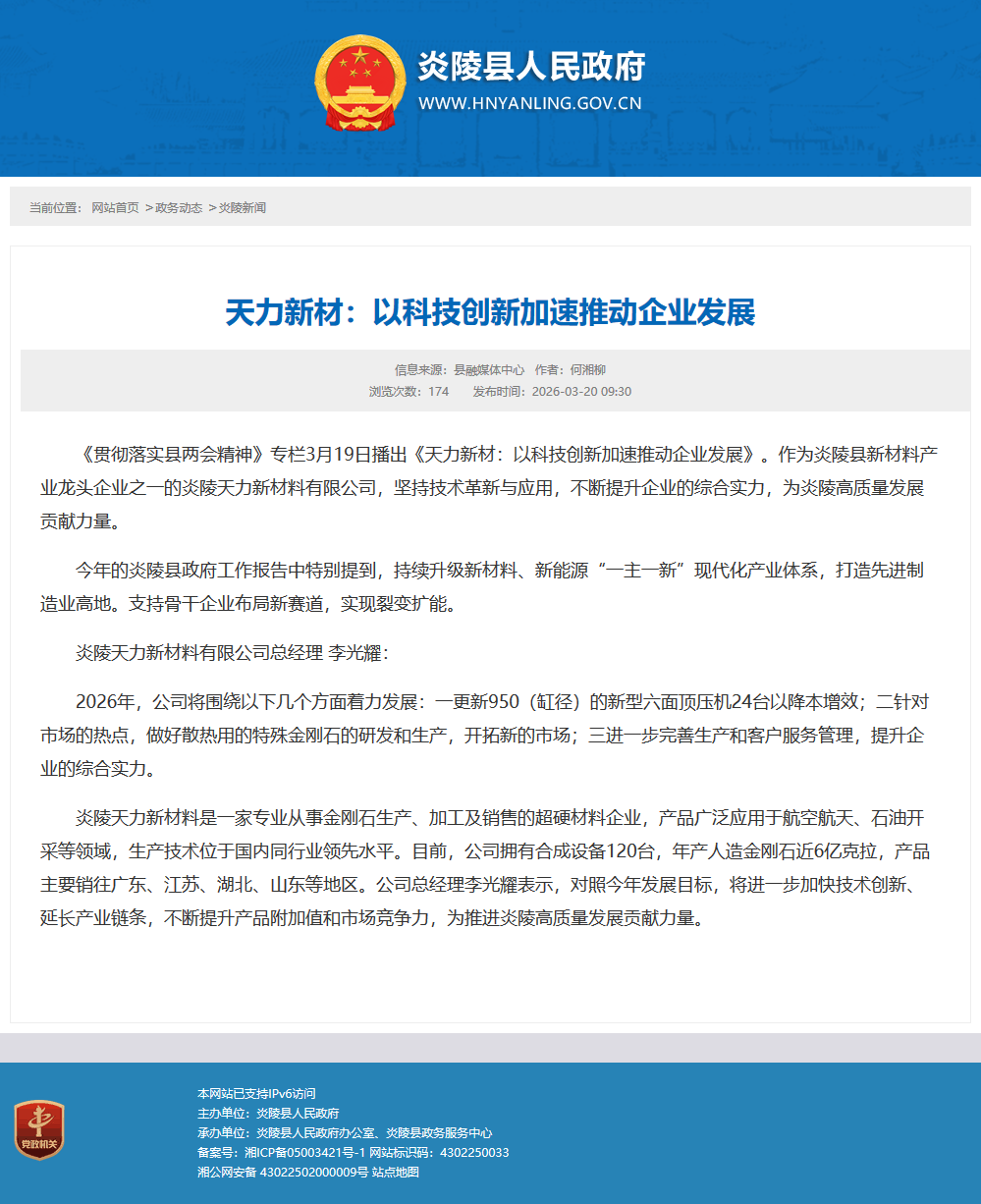 炎陵天力新材料是一家专业从事金刚石生产、加工及销售的超硬材料企业,产品广泛应用于航空航天、石油开采等领域,生产技术位于国内同行业领先水平。目前,公司拥有合成设备120台,年产人造金刚石近6亿克拉,产品主要销往广东、江苏、湖北、山东等地区。公司总经理李光耀表示,对照今年发展目标,将进一步加快技术创新、延长产业链条,不断提升产品附加值和市场竞争力,为推进炎陵高质量发展贡献力量。