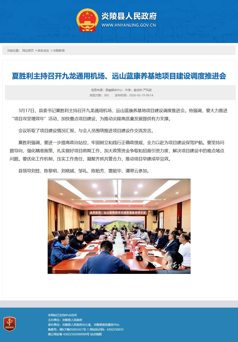 3月17日,县委书记夏胜利主持召开九龙通用机场、远山蓝康养基地项目建设调度推进会。他强调,要大力推进“项目攻坚增效年”活动,加快重点项目建设,为推动炎陵高质量发展提供有力支撑。