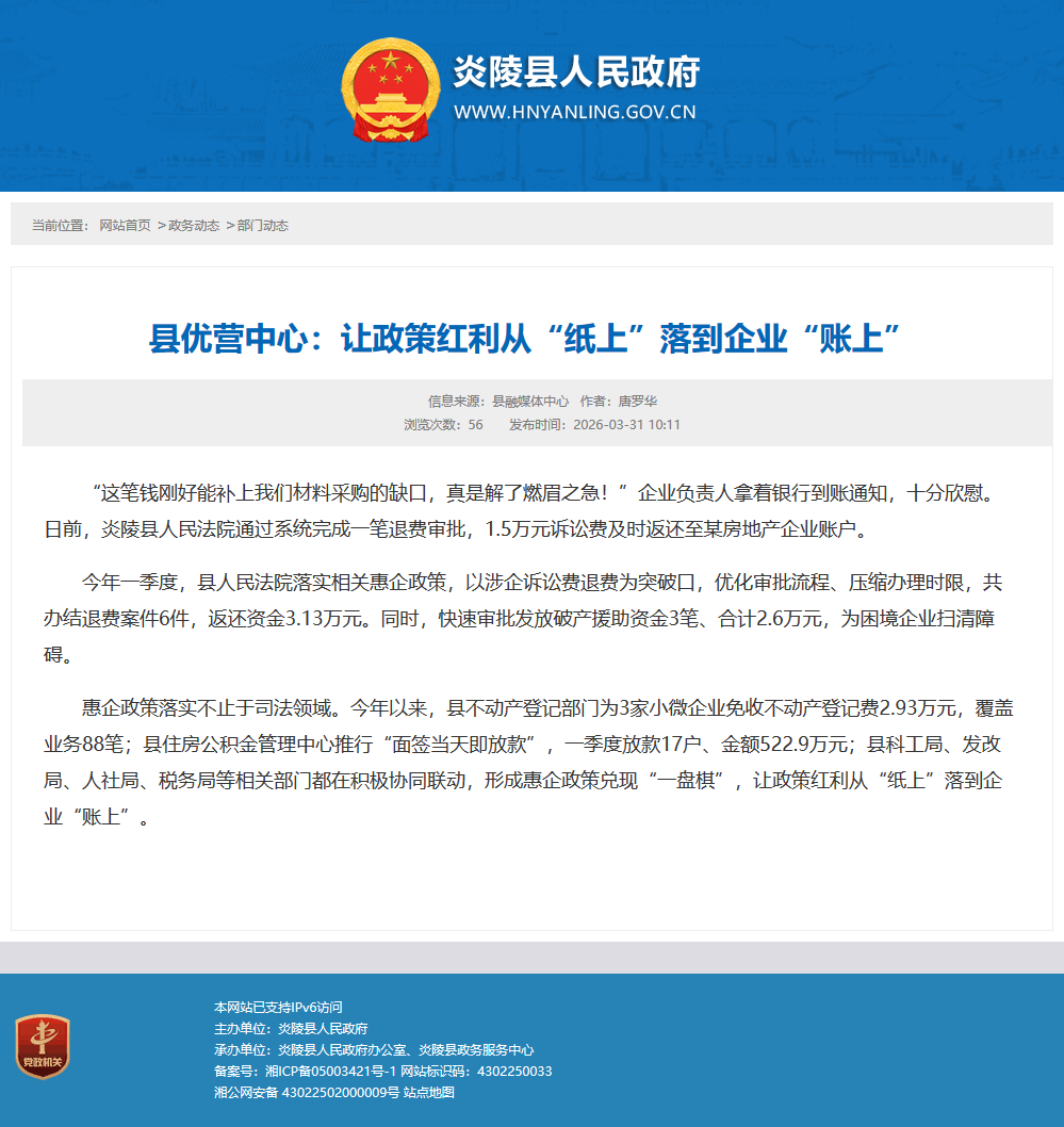 惠企政策落实不止于司法领域。今年以来,县不动产登记部门为3家小微企业免收不动产登记费2.93万元,覆盖业务88笔;县住房公积金管理中心推行“面签当天即放款”,一季度放款17户、金额522.9万元;县科工局、发改局、人社局、税务局等相关部门都在积极协同联动,形成惠企政策兑现“一盘棋”,让政策红利从“纸上”落到企业“账上”。