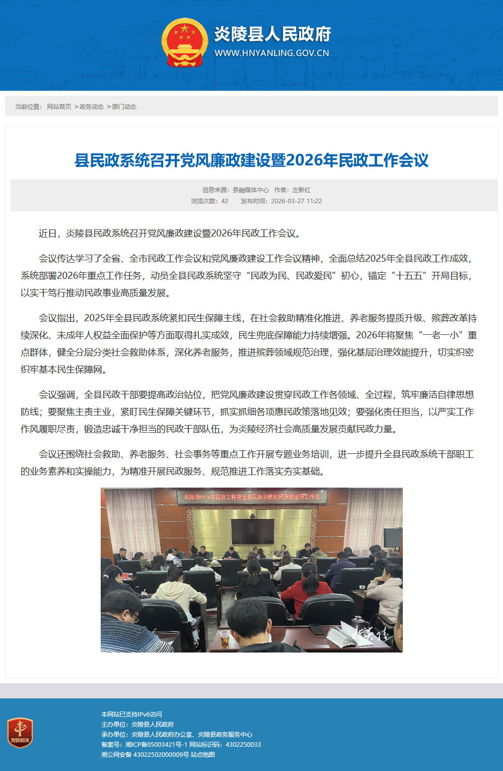 近日,炎陵县民政系统召开党风廉政建设暨2026年民政工作会议。