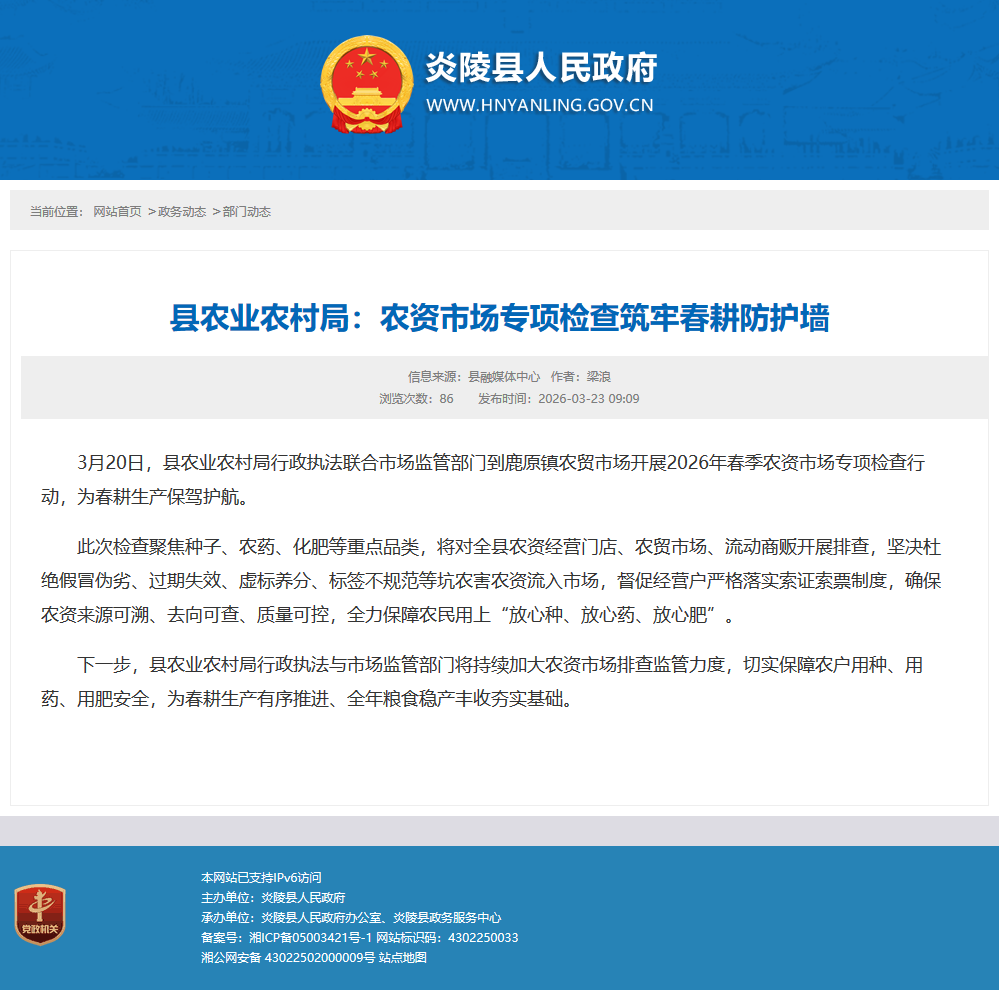 此次检查聚焦种子、农药、化肥等重点品类,将对全县农资经营门店、农贸市场、流动商贩开展排查,坚决杜绝假冒伪劣、过期失效、虚标养分、标签不规范等坑农害农资流入市场,督促经营户严格落实索证索票制度,确保农资来源可溯、去向可查、质量可控,全力保障农民用上“放心种、放心药、放心肥”。