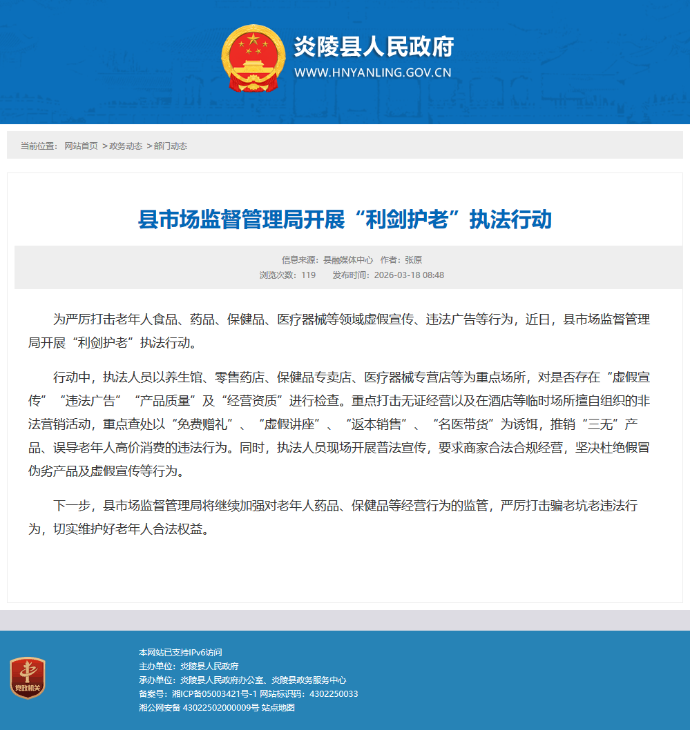 为严厉打击老年人食品、药品、保健品、医疗器械等领域虚假宣传、违法广告等行为,近日,县市场监督管理局开展“利剑护老”执法行动。