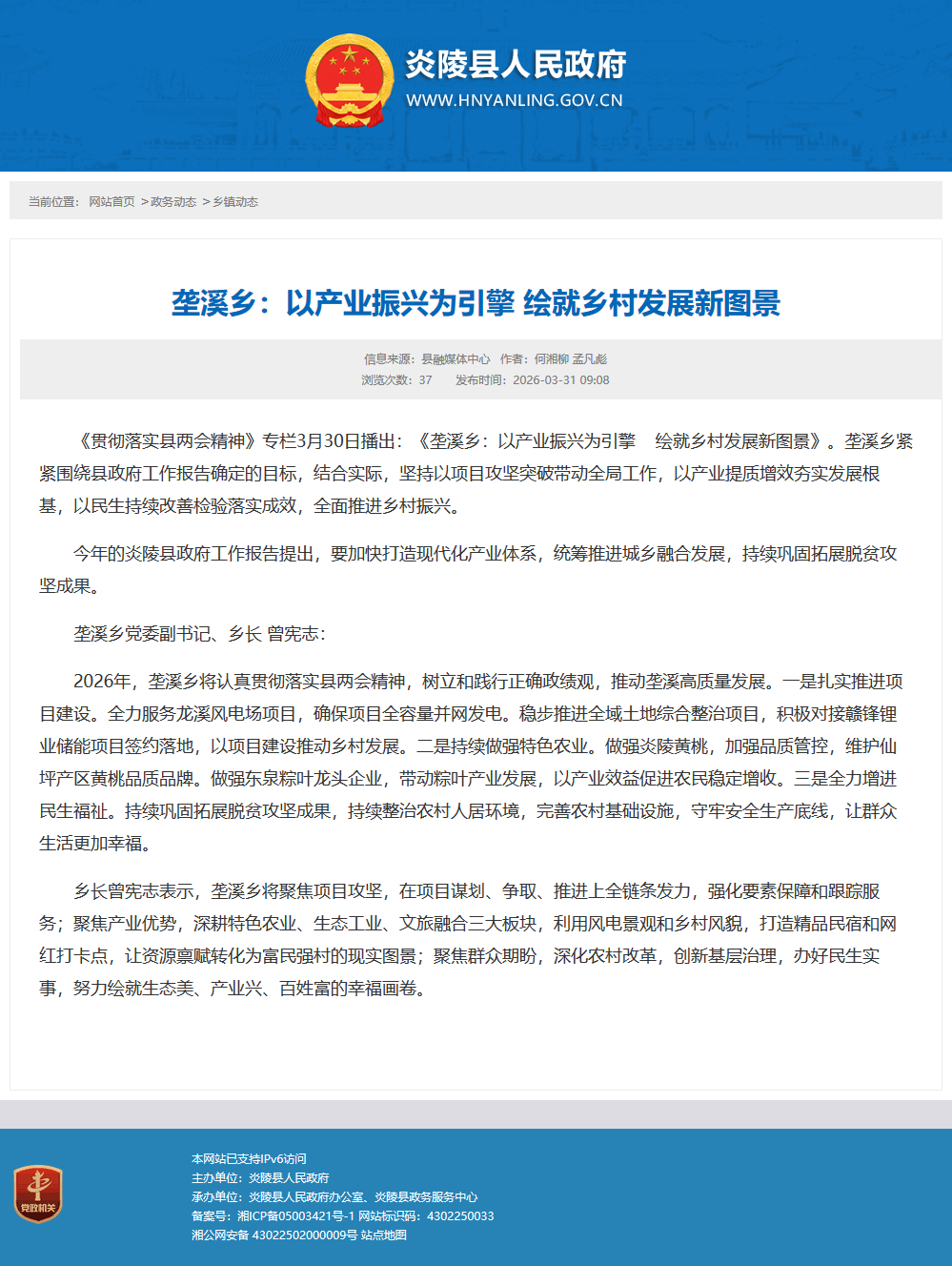 《贯彻落实县两会精神》专栏3月30日播出:《垄溪乡:以产业振兴为引擎 绘就乡村发展新图景》。垄溪乡紧紧围绕县政府工作报告确定的目标,结合实际,坚持以项目攻坚突破带动全局工作,以产业提质增效夯实发展根基,以民生持续改善检验落实成效,全面推进乡村振兴。