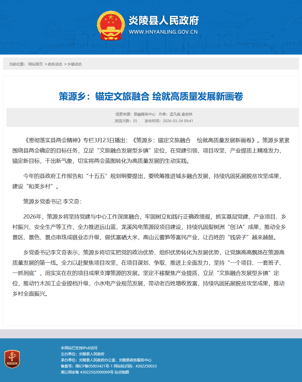 《贯彻落实县两会精神》专栏3月23日播出:《策源乡:锚定文旅融合 绘就高质量发展新画卷》。策源乡紧紧围绕县两会确定的目标任务,立足“文旅融合发展型乡镇”定位,在党建引领,项目攻坚、产业提质上精准发力,锚定新目标,干出新气象,切实将两会蓝图转化为高质量发展的生动实践。