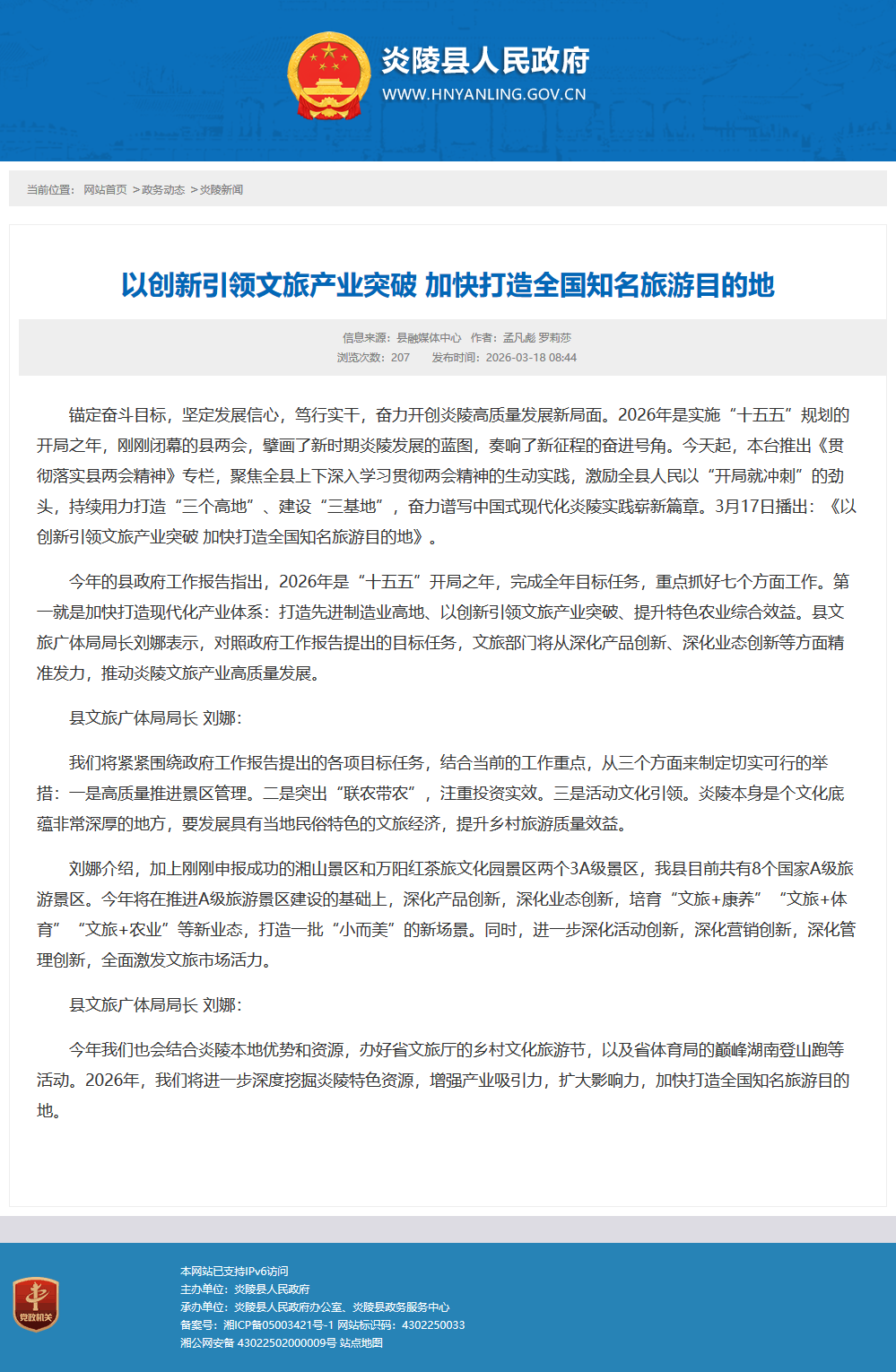 今年的县政府工作报告指出,2026年是“十五五”开局之年,完成全年目标任务,重点抓好七个方面工作。第一就是加快打造现代化产业体系:打造先进制造业高地、以创新引领文旅产业突破、提升特色农业综合效益。县文旅广体局局长刘娜表示,对照政府工作报告提出的目标任务,文旅部门将从深化产品创新、深化业态创新等方面精准发力,推动炎陵文旅产业高质量发展。