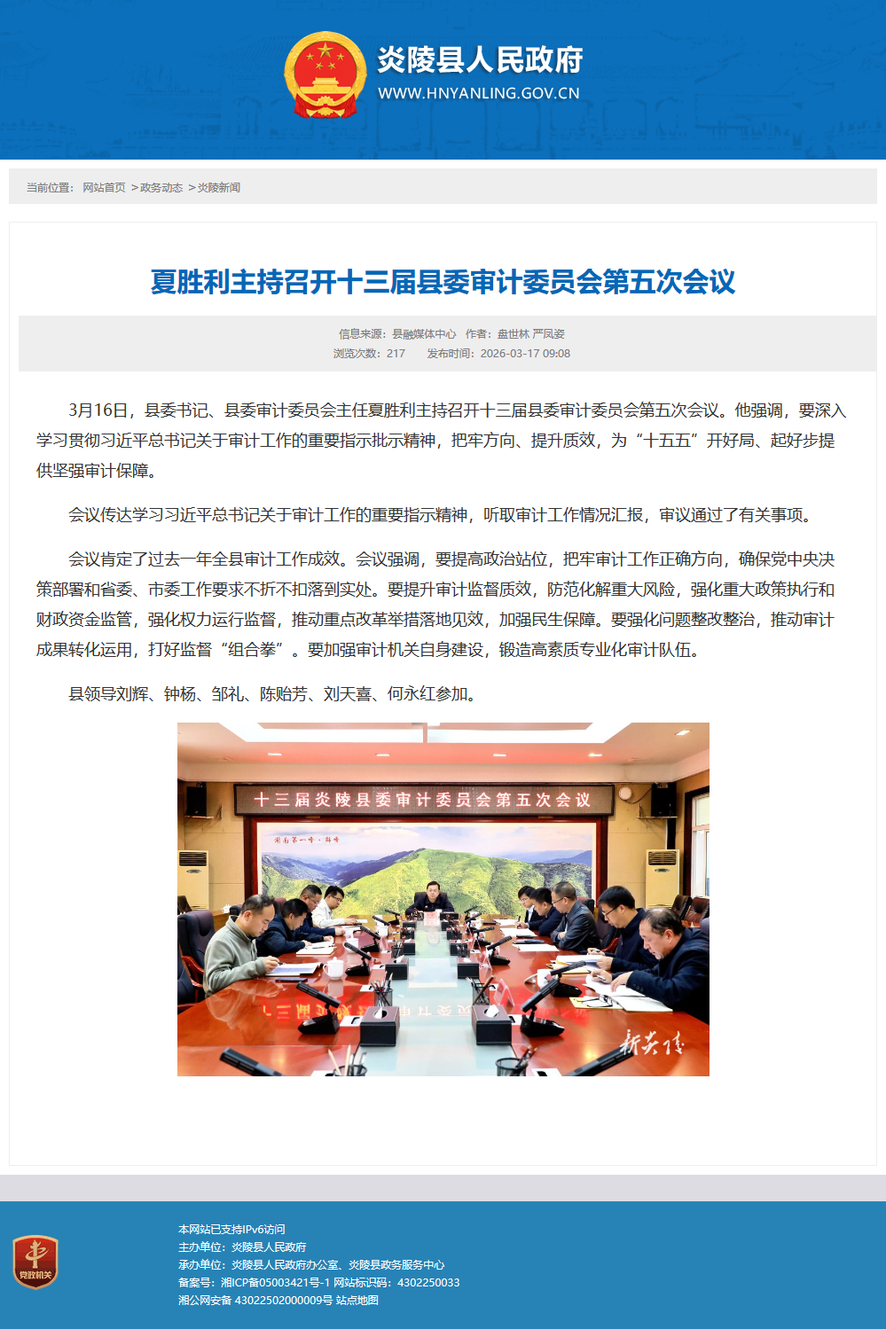 3月16日,县委书记、县委审计委员会主任夏胜利主持召开十三届县委审计委员会第五次会议。他强调,要深入学习贯彻习近平总书记关于审计工作的重要指示批示精神,把牢方向、提升质效,为“十五五”开好局、起好步提供坚强审计保障。