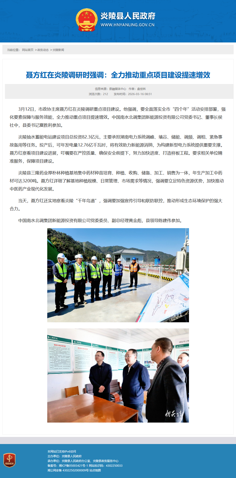 3月12日,市政协主席聂方红在炎陵调研重点项目建设。他强调,要全面落实全市“四个年”活动安排部署,强化要素保障与服务效能,全力推动重点项目提速增效。中国南水北调集团新能源投资有限公司党委书记、董事长侯社中,县委书记夏胜利参加。