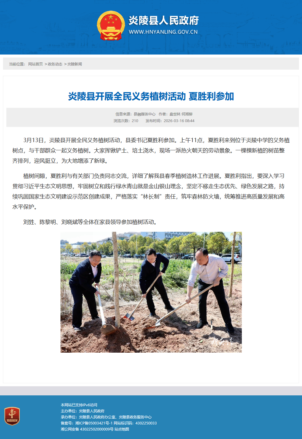 3月13日,炎陵县开展全民义务植树活动,县委书记夏胜利参加。上午11点,夏胜利来到位于炎陵中学的义务植树点,与干部群众一起义务植树。大家挥锹铲土、培土浇水,现场一派热火朝天的劳动景象。一棵棵新植的树苗整齐排列,迎风挺立,为大地增添了新绿。