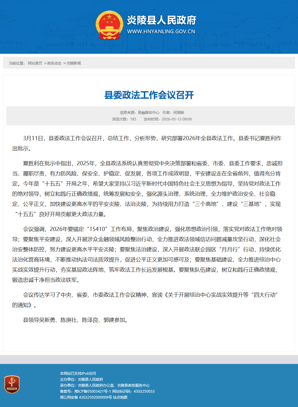 夏胜利在批示中指出,2025年,全县政法系统认真贯彻党中央决策部署和省委、市委、县委工作要求,忠诚担当、履职尽责,有力防风险、保安全、护稳定、促发展,各项工作成效明显,平安建设走在全省前列,值得充分肯定。今年是“十五五”开局之年,希望大家坚持以习近平新时代中国特色社会主义思想为指导,坚持党对政法工作的绝对领导,树立和践行正确政绩观,统筹发展和安全,强化源头治理、系统治理,全力维护政治安全、社会稳定、公平正义,加快建设更高水平的平安炎陵、法治炎陵,为持续用力打造“三个高地”、建设“三基地”,实现“十五五”良好开局贡献更大政法力量。