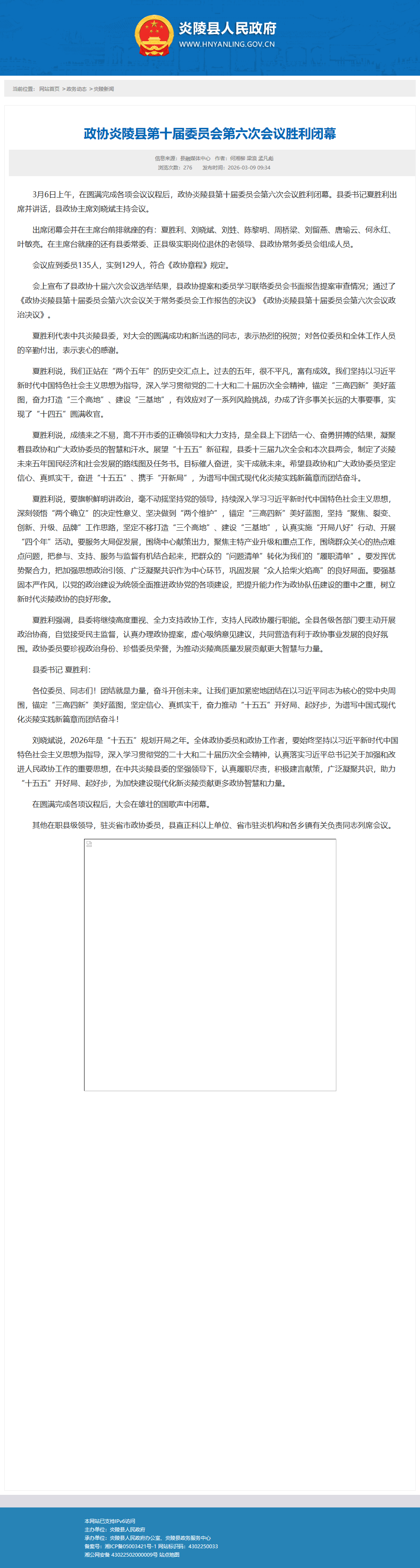 夏胜利说,成绩来之不易,离不开市委的正确领导和大力支持,是全县上下团结一心、奋勇拼搏的结果,凝聚着县政协和广大政协委员的智慧和汗水。展望“十五五”新征程,县委十三届九次全会和本次县两会,制定了炎陵未来五年国民经济和社会发展的路线图及任务书。目标催人奋进,实干成就未来。希望县政协和广大政协委员坚定信心、真抓实干,奋进“十五五”、携手“开新局”,为谱写中国式现代化炎陵实践新篇章而团结奋斗。