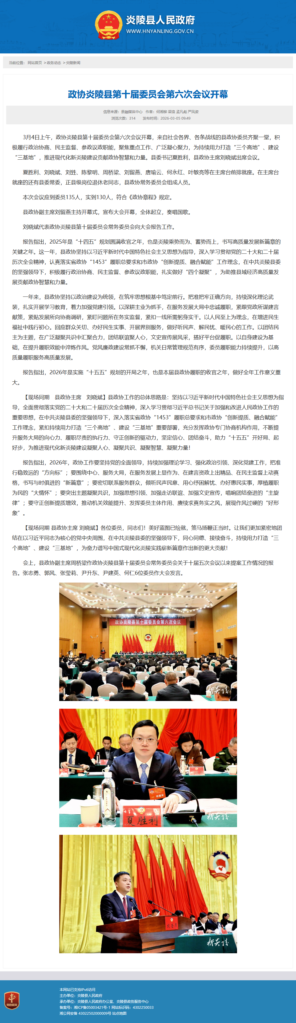 报告指出,2025年是“十四五”规划圆满收官之年,也是炎陵乘势而为、蓄势而上,书写高质量发展新篇章的关键之年。这一年,县政协坚持以习近平新时代中国特色社会主义思想为指导,深入学习贯彻党的二十大和二十届历次全会精神,认真落实省政协“1453”履职总要求和市政协“创新提质、融合赋能”工作理念,在中共炎陵县委的坚强领导下,积极履行政治协商、民主监督、参政议政职能,扎实做好“四个凝聚”,为助推县域经济高质量发展贡献政协智慧和力量。