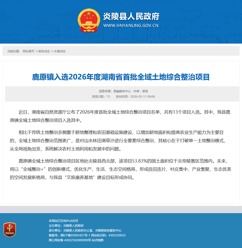 近日,湖南省自然资源厅公布了2026年度首批全域土地综合整治项目名单,共有13个项目入选。其中,我县鹿原镇全域土地综合整治项目入选其中。