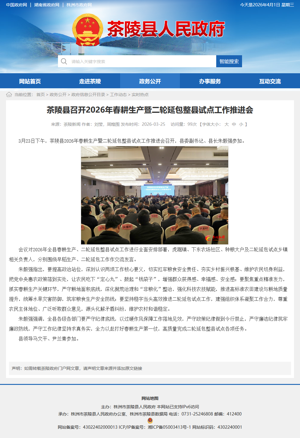 3月23日下午,茶陵县2026年春耕生产暨二轮延包整县试点工作推进会召开,县委副书记、县长朱毅强参加。