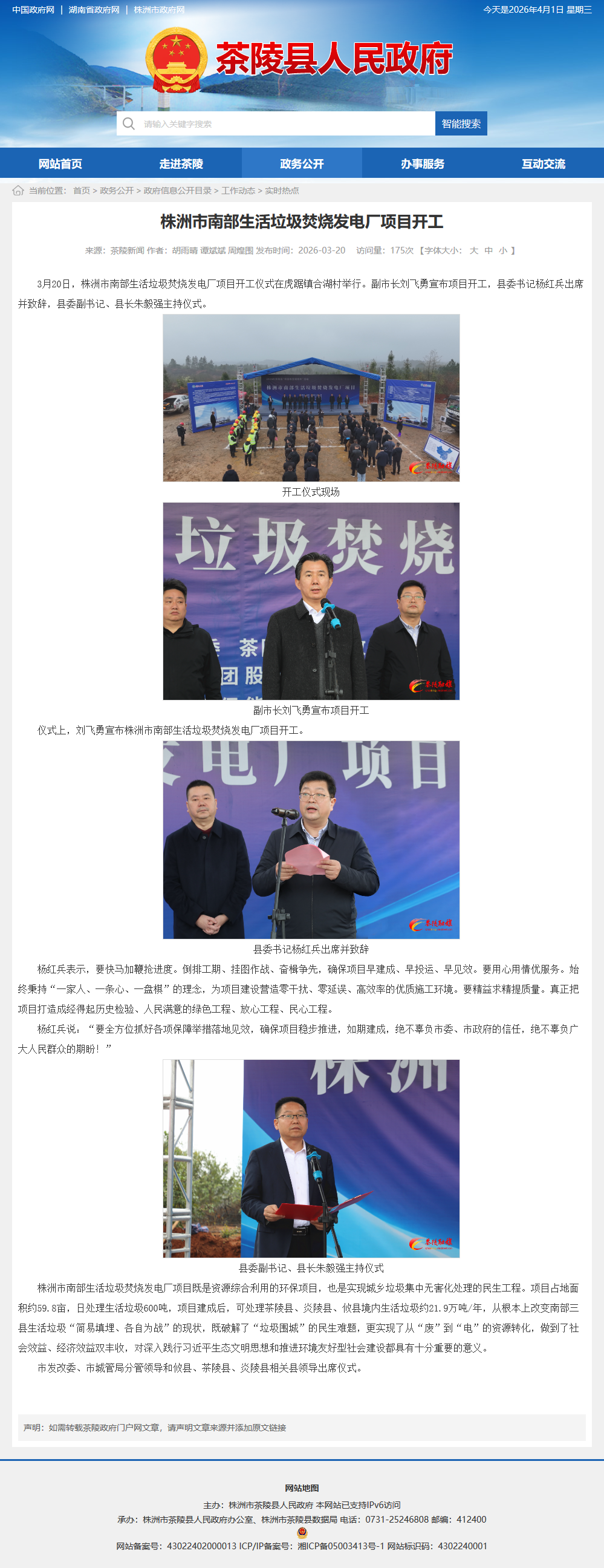 3月20日,株洲市南部生活垃圾焚烧发电厂项目开工仪式在虎踞镇合湖村举行。副市长刘飞勇宣布项目开工,县委书记杨红兵出席并致辞,县委副书记、县长朱毅强主持仪式。