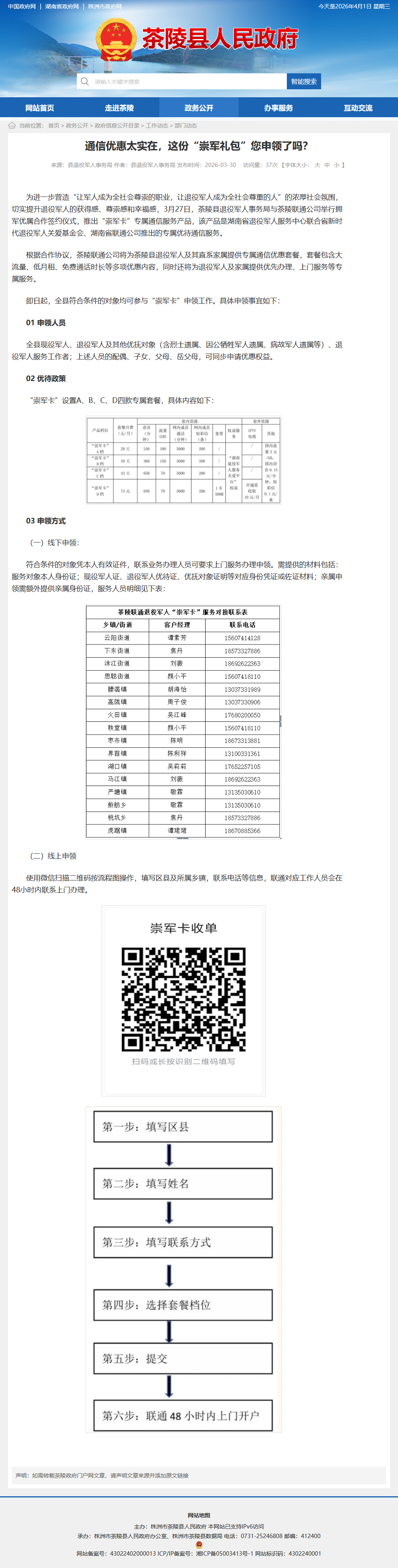 根据合作协议,茶陵联通公司将为茶陵县退役军人及其直系家属提供专属通信优惠套餐,套餐包含大流量、低月租、免费通话时长等多项优惠内容,同时还将为退役军人及家属提供优先办理、上门服务等专属服务。