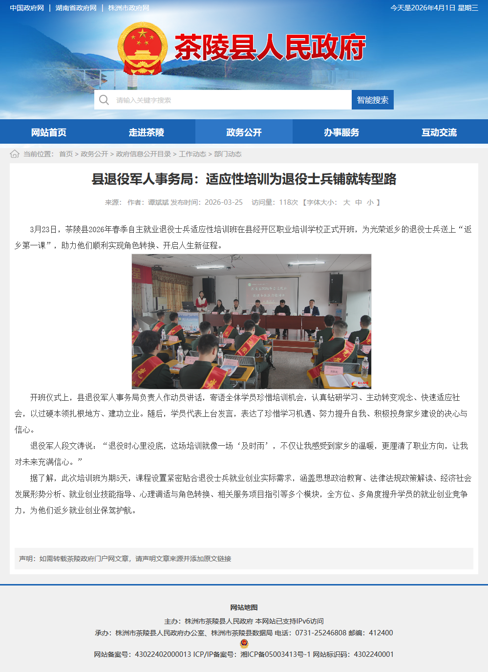 3月23日,茶陵县2026年春季自主就业退役士兵适应性培训班在县经开区职业培训学校正式开班,为光荣返乡的退役士兵送上“返乡第一课”,助力他们顺利实现角色转换、开启人生新征程。