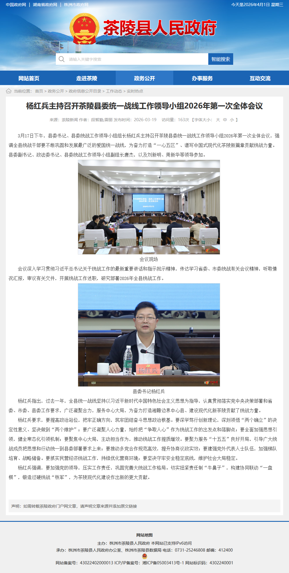 3月17日下午,县委书记、县委统战工作领导小组组长杨红兵主持召开茶陵县委统一战线工作领导小组2026年第一次全体会议,强调全县统战干部要不断巩固和发展最广泛的爱国统一战线,为奋力打造“一心五区”、谱写中国式现代化茶陵新篇章贡献统战力量。县委副书记、政法委书记、县委统战工作领导小组副组长唐杰,以及刘新明、周新华等领导参加。