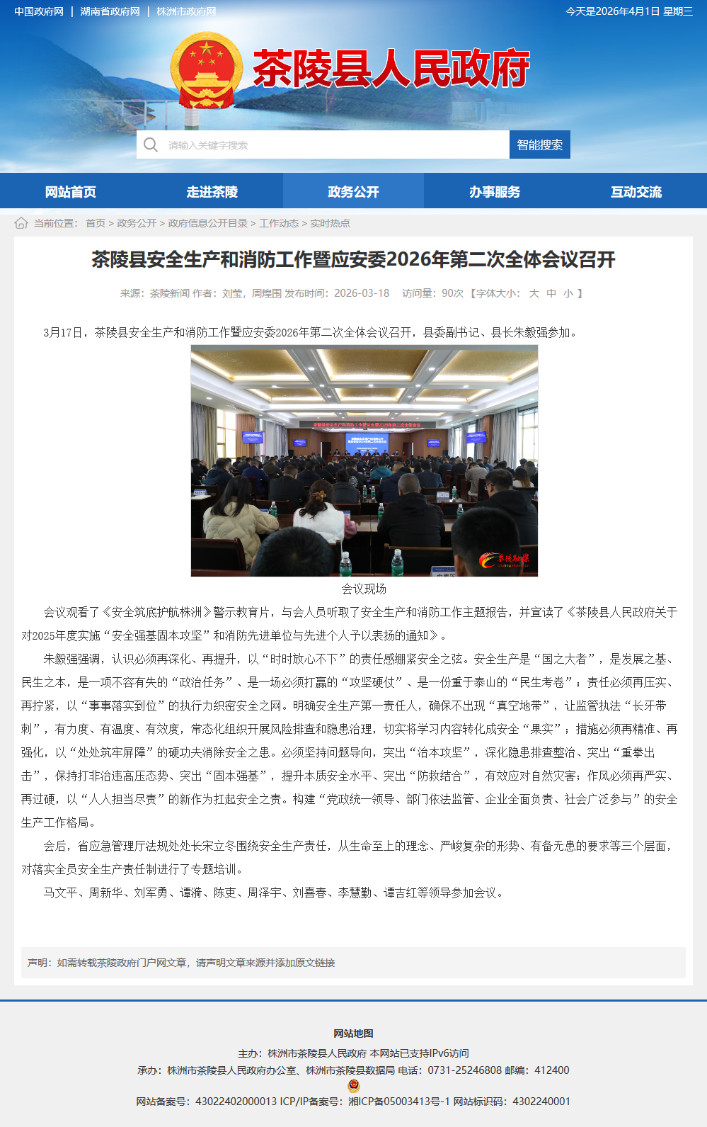 3月17日,茶陵县安全生产和消防工作暨应安委2026年第二次全体会议召开,县委副书记、县长朱毅强参加。