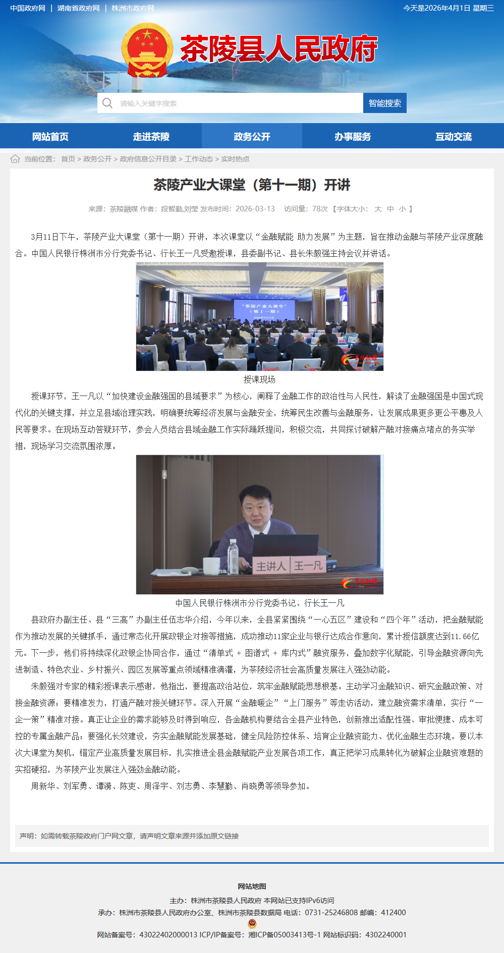 3月11日下午,茶陵产业大课堂(第十一期)开讲,本次课堂以“金融赋能 助力发展”为主题,旨在推动金融与茶陵产业深度融合。中国人民银行株洲市分行党委书记、行长王一凡受邀授课,县委副书记、县长朱毅强主持会议并讲话。