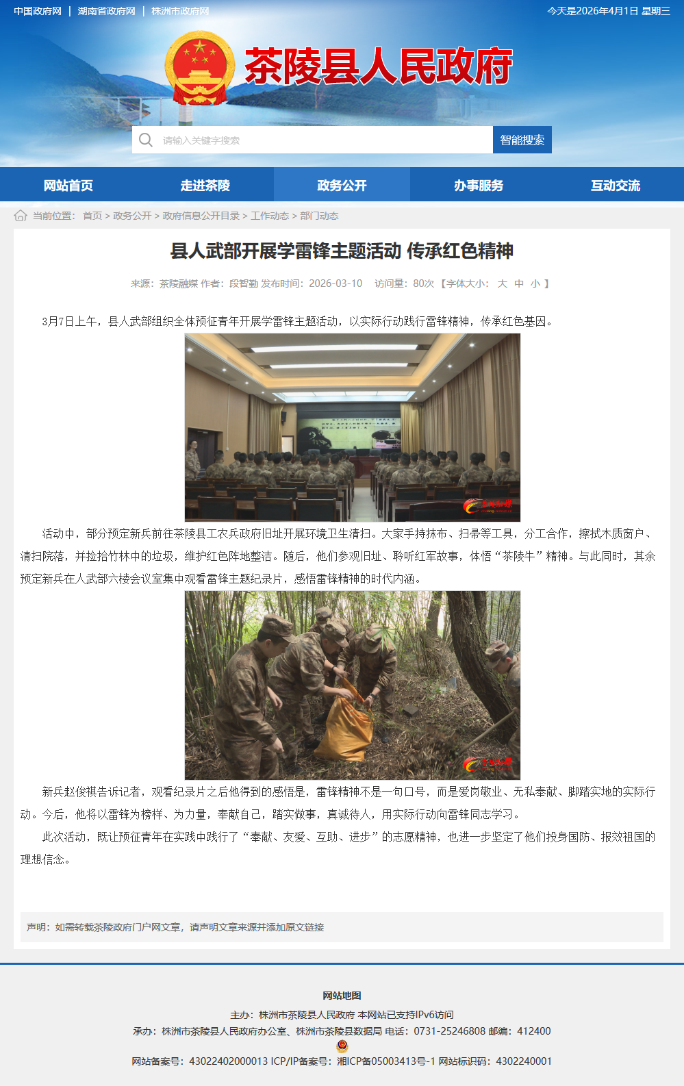 活动中,部分预定新兵前往茶陵县工农兵政府旧址开展环境卫生清扫。大家手持抹布、扫帚等工具,分工合作,擦拭木质窗户、清扫院落,并捡拾竹林中的垃圾,维护红色阵地整洁。随后,他们参观旧址、聆听红军故事,体悟“茶陵牛”精神。与此同时,其余预定新兵在人武部六楼会议室集中观看雷锋主题纪录片,感悟雷锋精神的时代内涵。