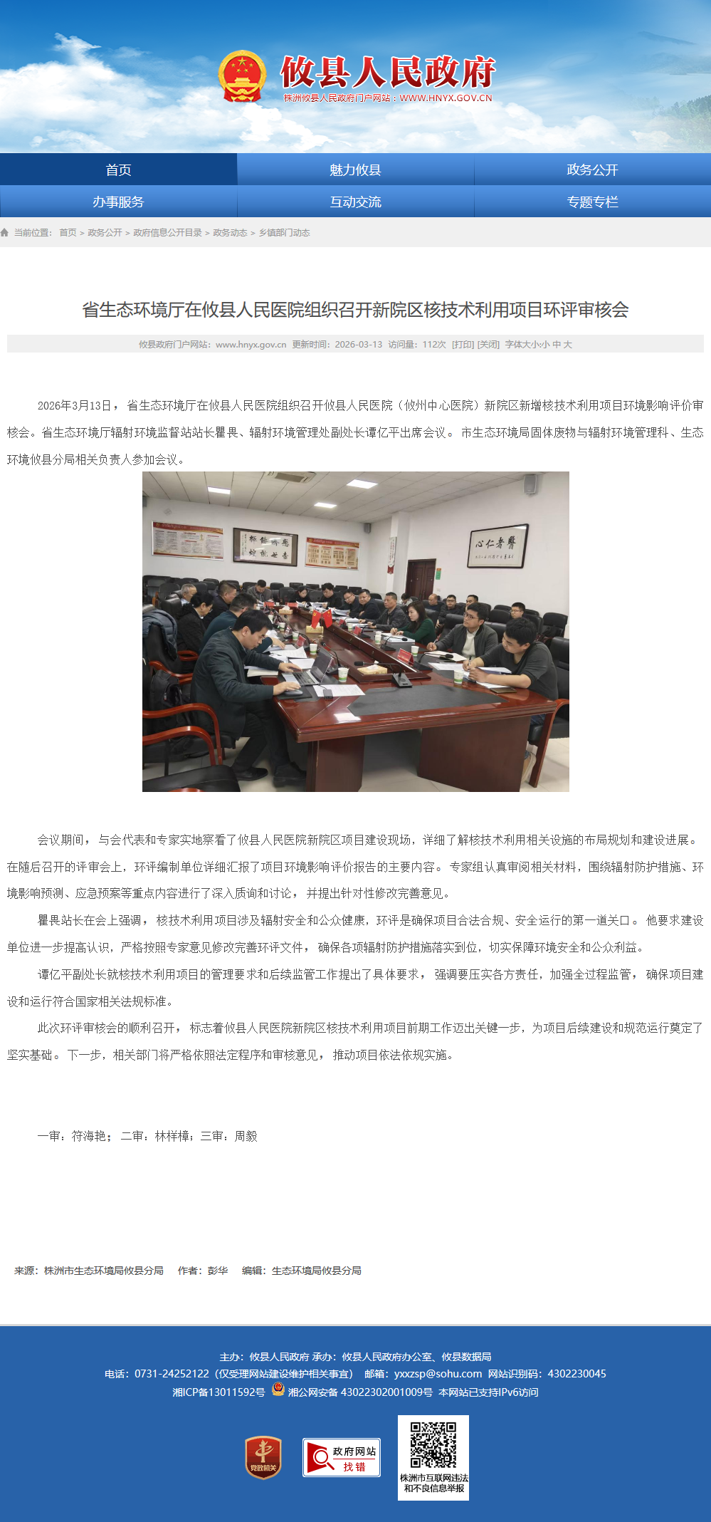 2026年3月13日,省生态环境厅在攸县人民医院组织召开攸县人民医院(攸州中心医院)新院区新增核技术利用项目环境影响评价审核会。省生态环境厅辐射环境监督站站长瞿畏、辐射环境管理处副处长谭亿平出席会议。市生态环境局固体废物与辐射环境管理科、生态环境攸县分局相关负责人参加会议。