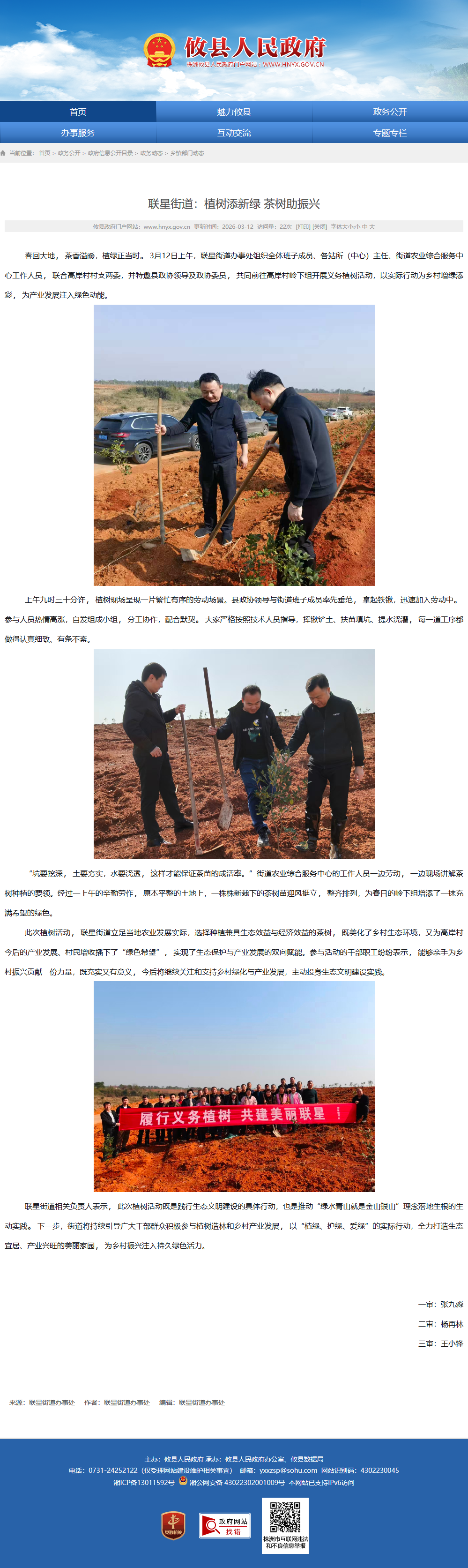 春回大地,茶香溢暖,植绿正当时。3月12日上午,联星街道办事处组织全体班子成员、各站所(中心)主任、街道农业综合服务中心工作人员,联合高岸村村支两委,并特邀县政协领导及政协委员,共同前往高岸村岭下组开展义务植树活动,以实际行动为乡村增绿添彩,为产业发展注入绿色动能。